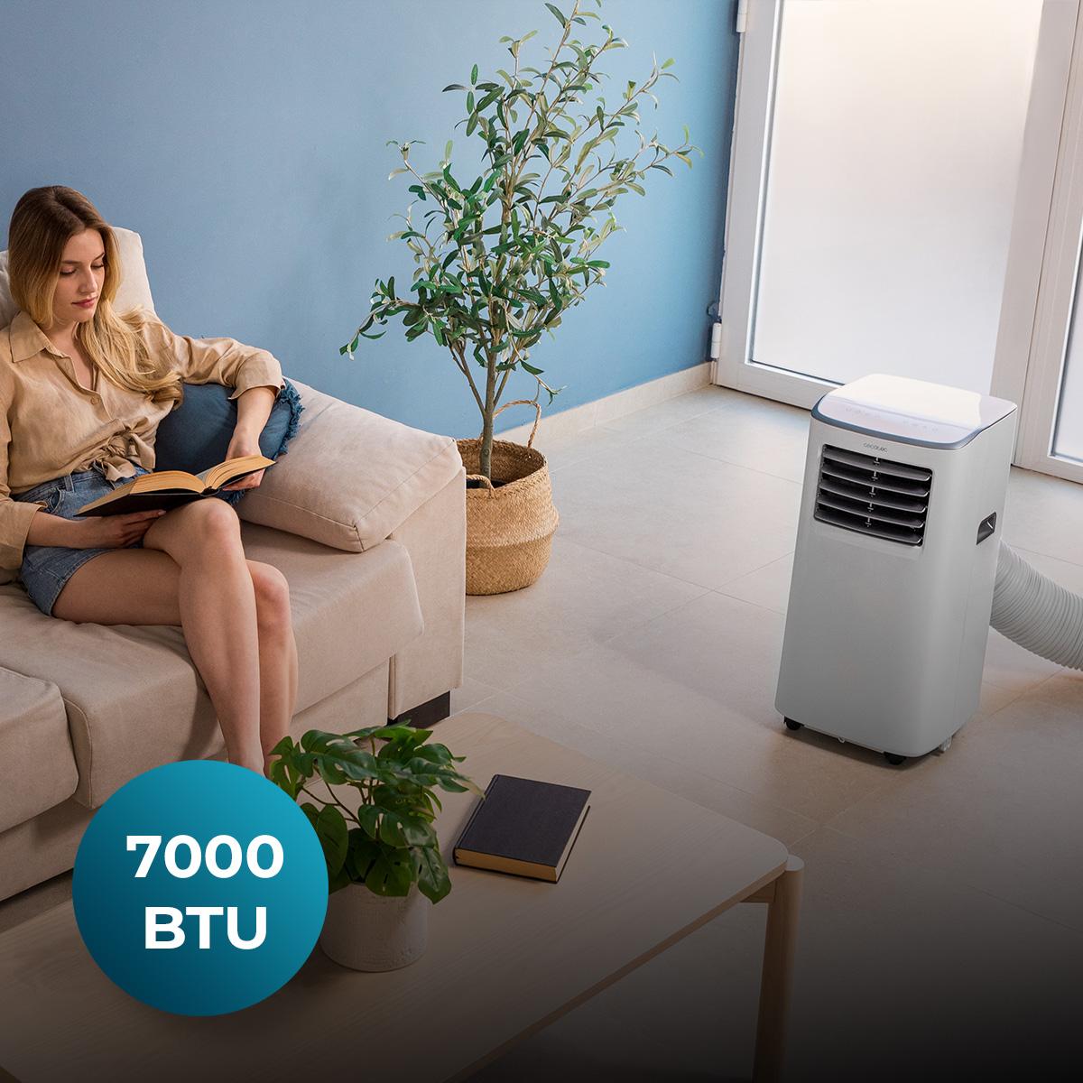 Aire acondicionado portátil de 7000 BTU con mando a distancia y control táctil.