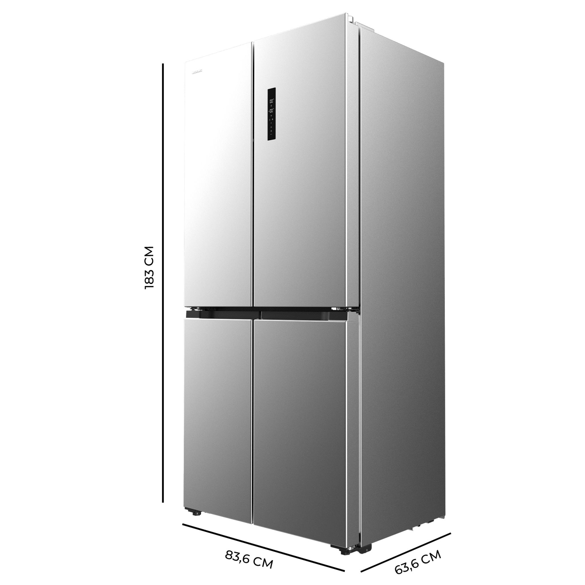 Frigorífico 4 puertas inox, 183cm alto y 83,6cm ancho, capacidad 436L, compresor Inverter Plus, Total No Frost clase energética E. Además, cuenta con distintos modos como Fast Cooling y Fast Freezing, así como sistemas como MultiAirFlow, Metal Cooling y modo vacaciones.