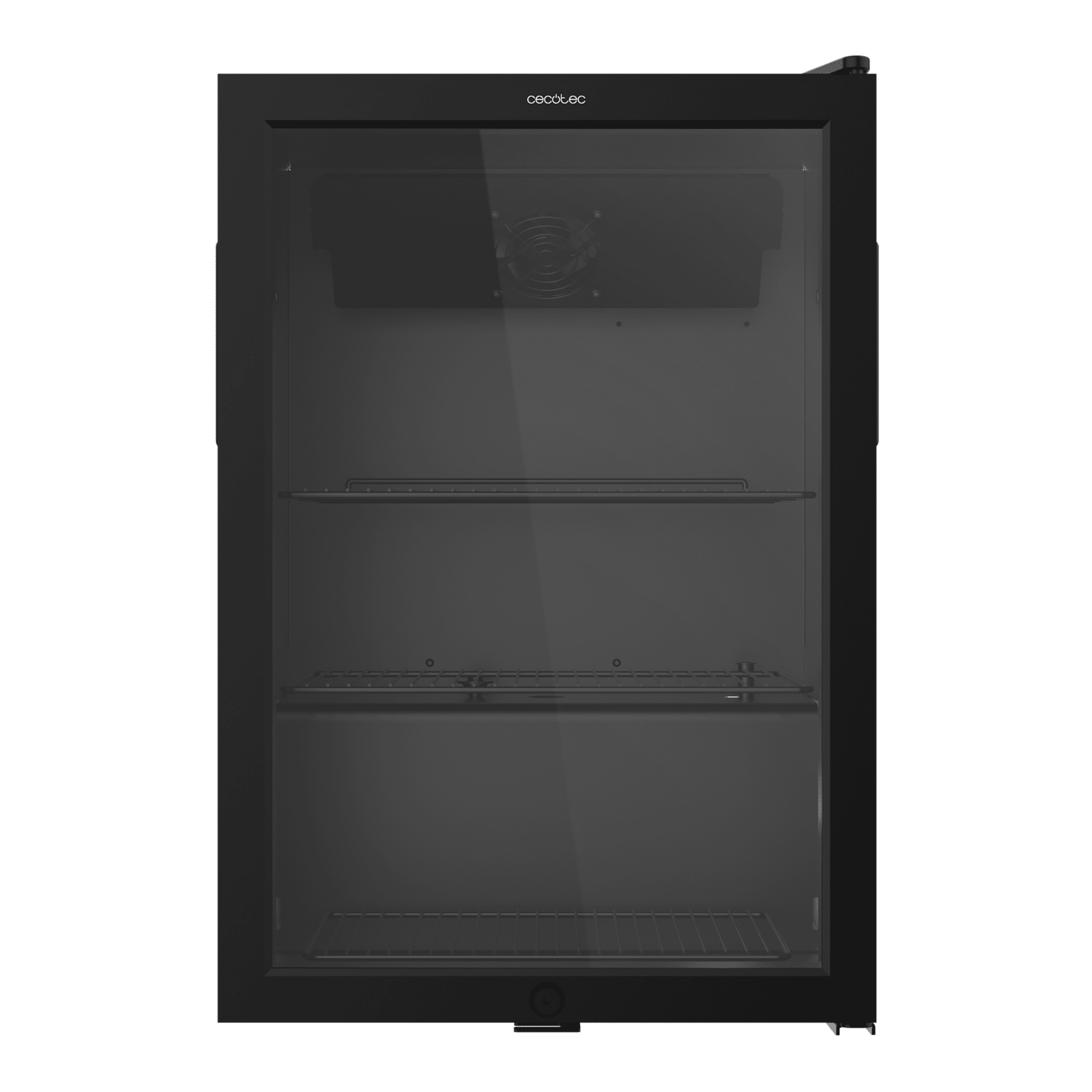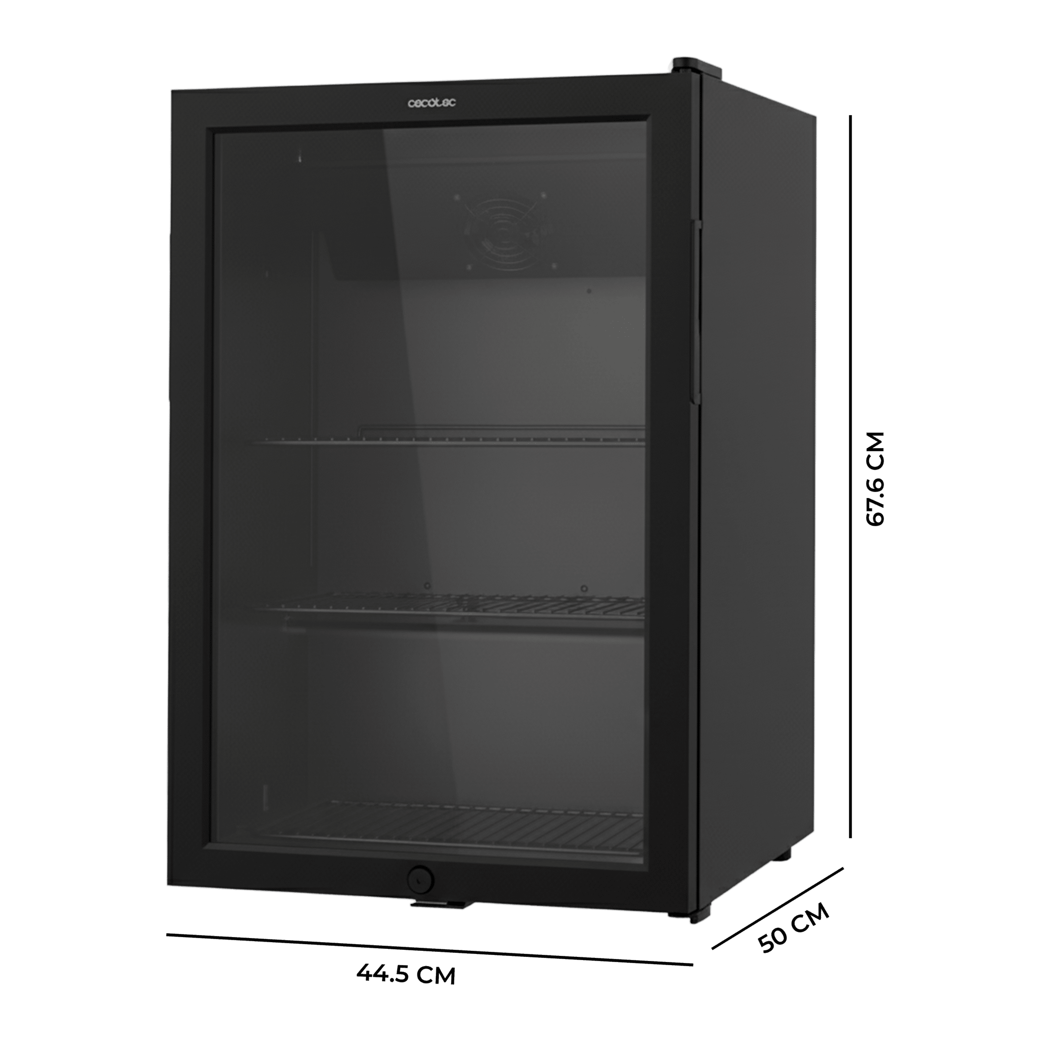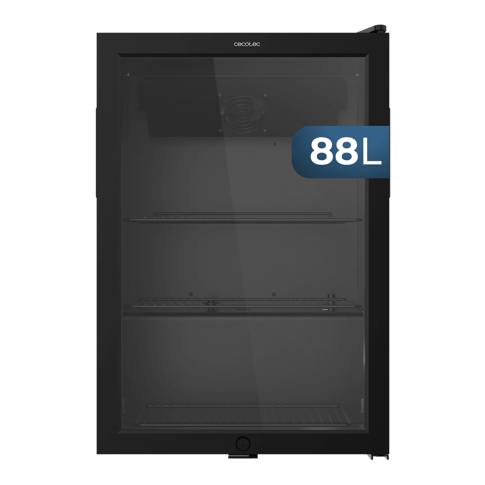 Nevera Mini Bar con puerta de cristal, chasis color negro, Capacidad 72 Litros (88 Latas de 33cl), compresor.