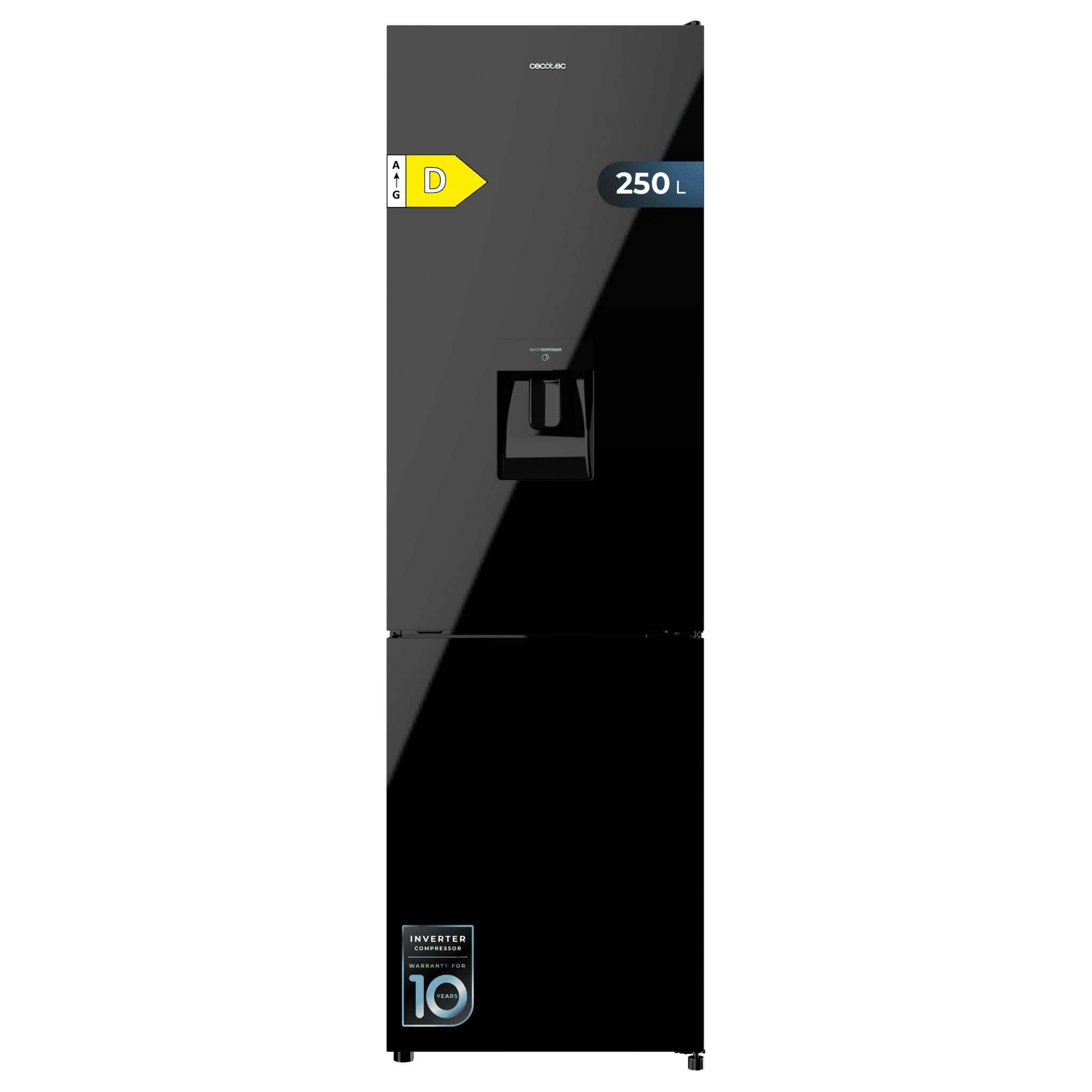 Frigorífico combi cristal negro de 180cm de alto y 55 cm de ancho, 250 litros , dispensador de agua, compresor Inverter Plus, Total no-frost y clase D
