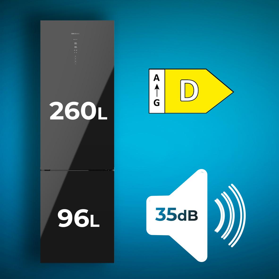 Combi con Capacidad 322 L. Multi Airflow. Total No Frost. Humidity/Crisper box, LED interior, Puerta reversible, Alarma de puerta, Control de temperatura. Color cristal negro Clasifición energética E. Ancho 59 /Fondo 63,5 /Alto 185,5cm