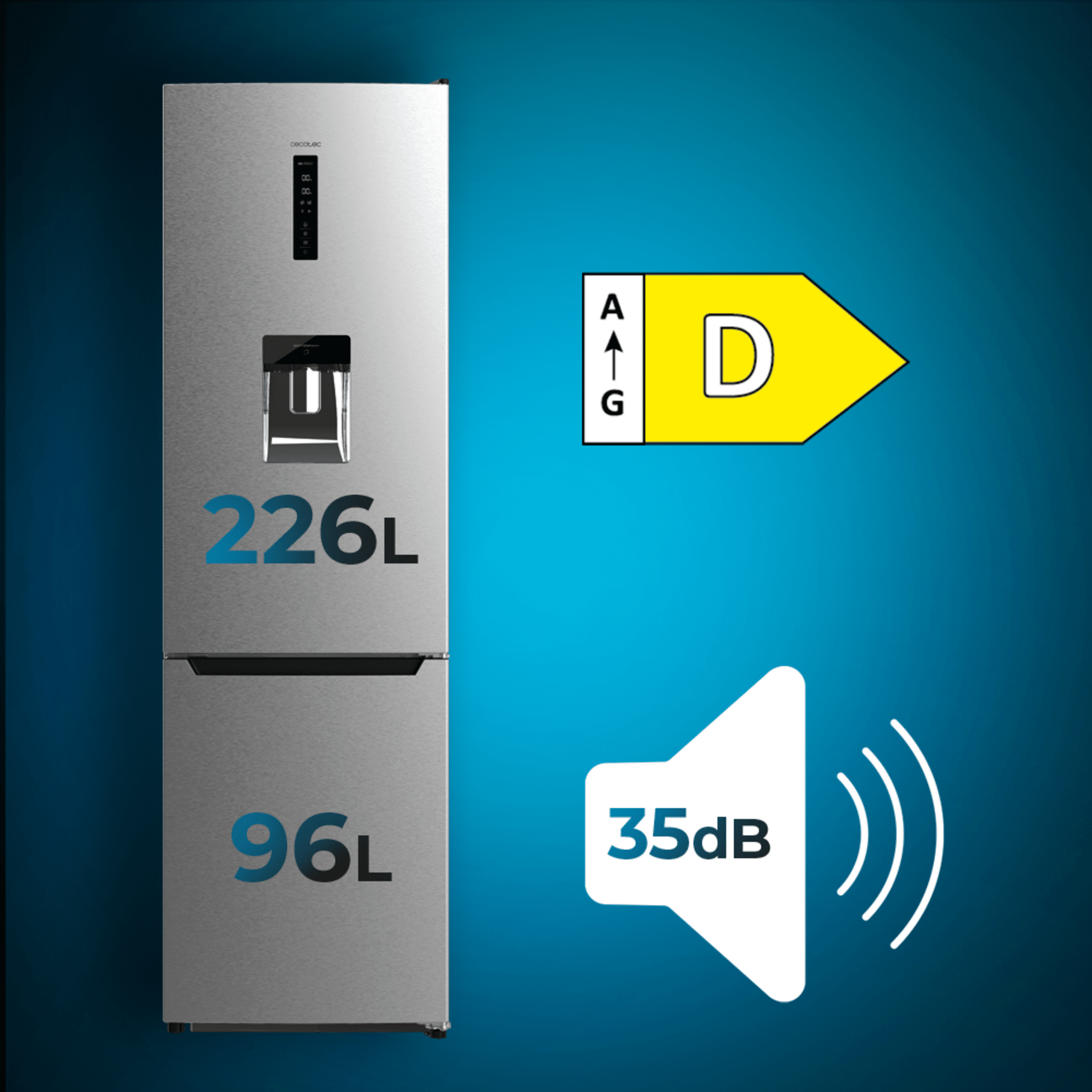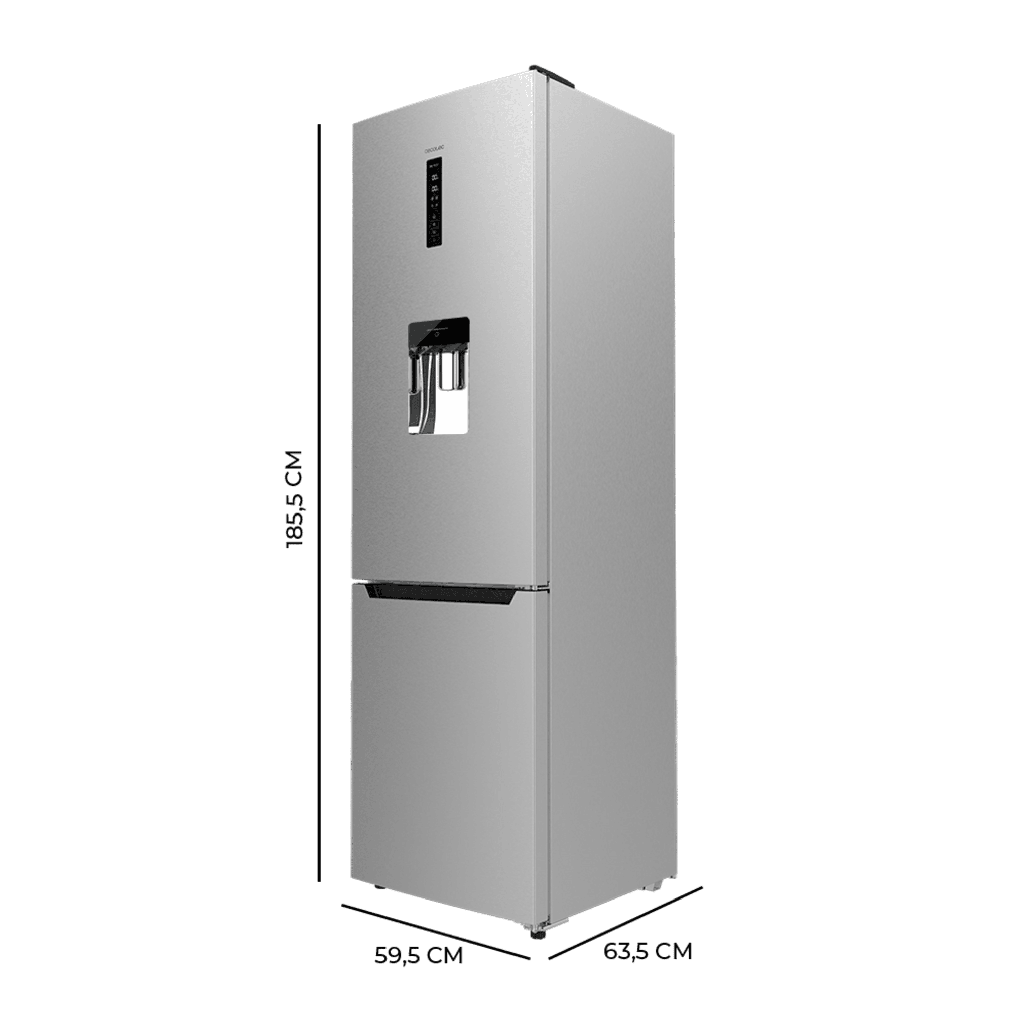 Combi con Capacidad 322 L. Multi Airflow. Total No Frost. Dispensador de agua. Humidity/Crisper box, LED interior, Puerta reversible, Alarma de puerta, Control de temperatura, Inverter Plus. Modo eco, Modo vacaciones, fast freezing y cooling, Display en la puerta. Color inox Clasifición energética D. Ancho 59 /Fondo 63,5 /Alto 185,5cm