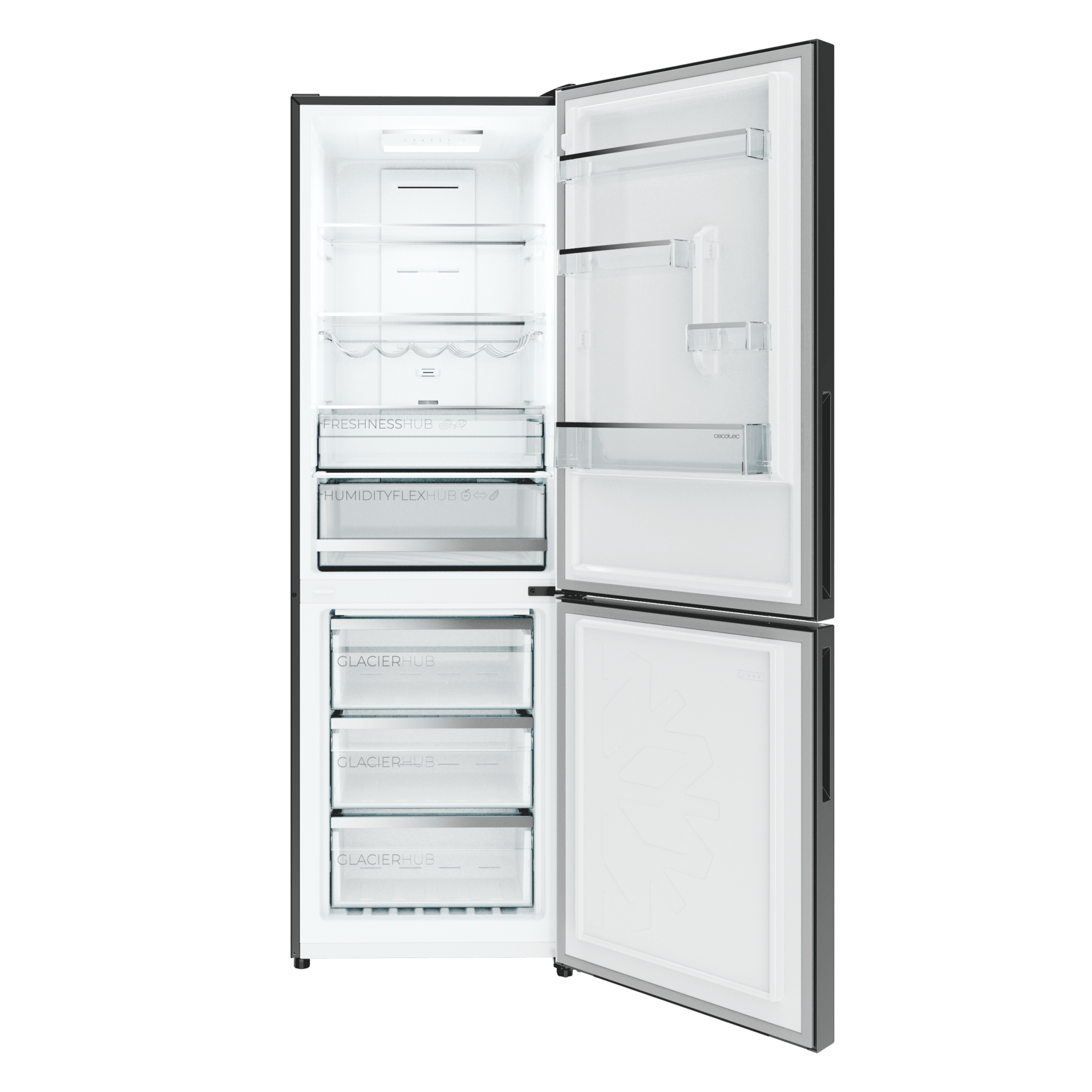 Combi con Capacidad 322 L. Multi Airflow. Total No Frost. Humidity/Crisper box, LED interior, Puerta reversible, Alarma de puerta, Control de temperatura, Inverter Plus. Modo eco, Modo vacaciones, fast freezing y cooling, Display en la puerta. Color Dark inox Clasifición energética D. Ancho 59 /Fondo 63,5 /Alto 185,5cm