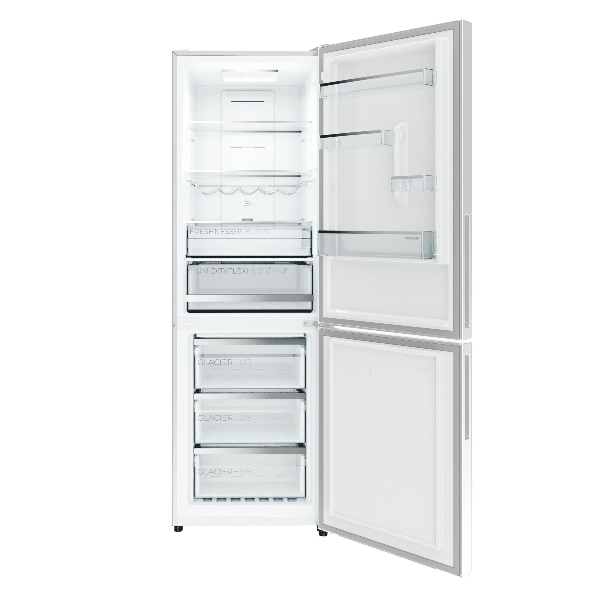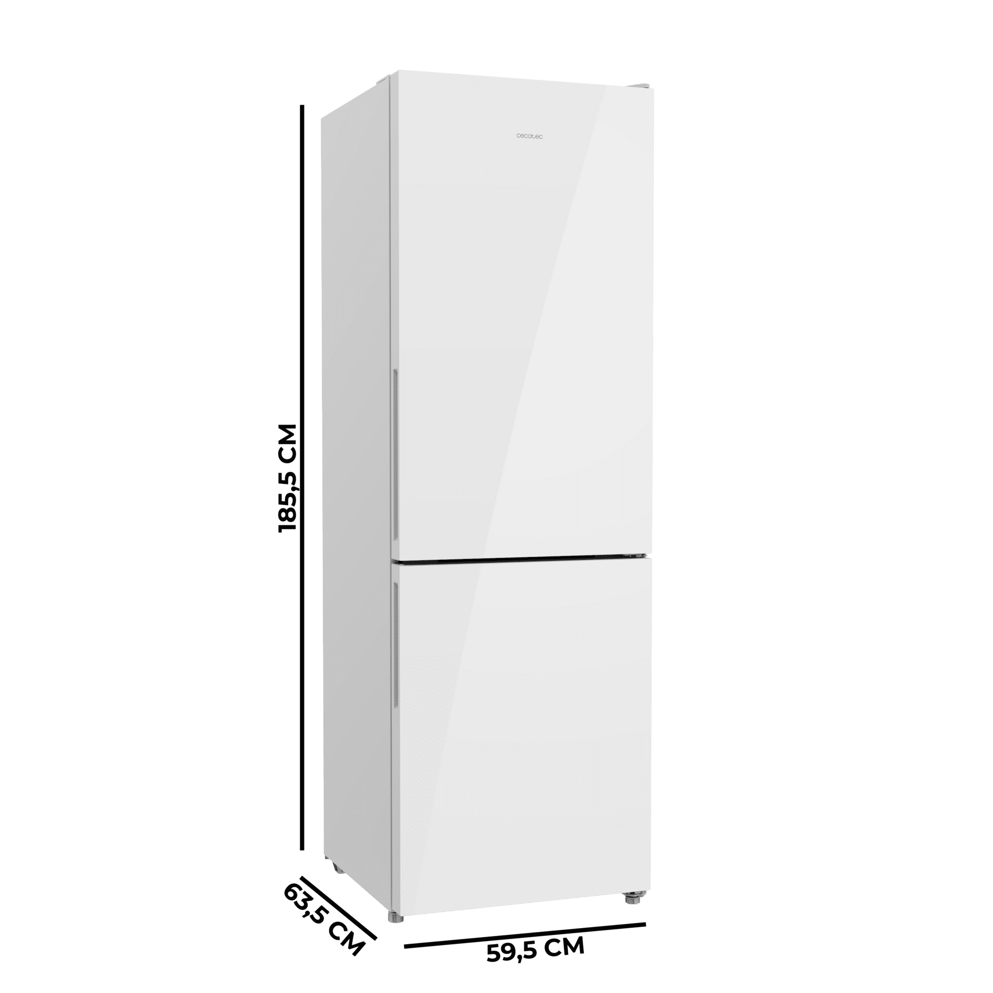 Combi con Capacidad 322 L. Multi Airflow. Total No Frost. Humidity/Crisper box, LED interior, Puerta reversible, Alarma de puerta, Control de temperatura. Color cristal blanco Clasifición energética E. Ancho 59 /Fondo 63,5 /Alto 185,5cm