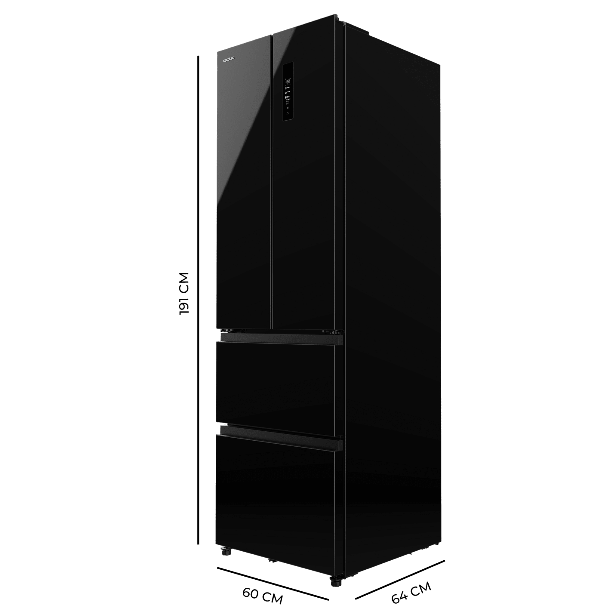 Frigorífico Combi French Door 4 Puertas Cristal Negro, 400 Litros, 60×191 cm, NoFrost, Multi AirFlow, Display, Interior Premium Color Gris, Cajón Convertible, Clase E, Motor Inverter, Fast Cooling, Fast Freezer, Modo ECO, Alarmas puerta abierta, temperatura y fallo.