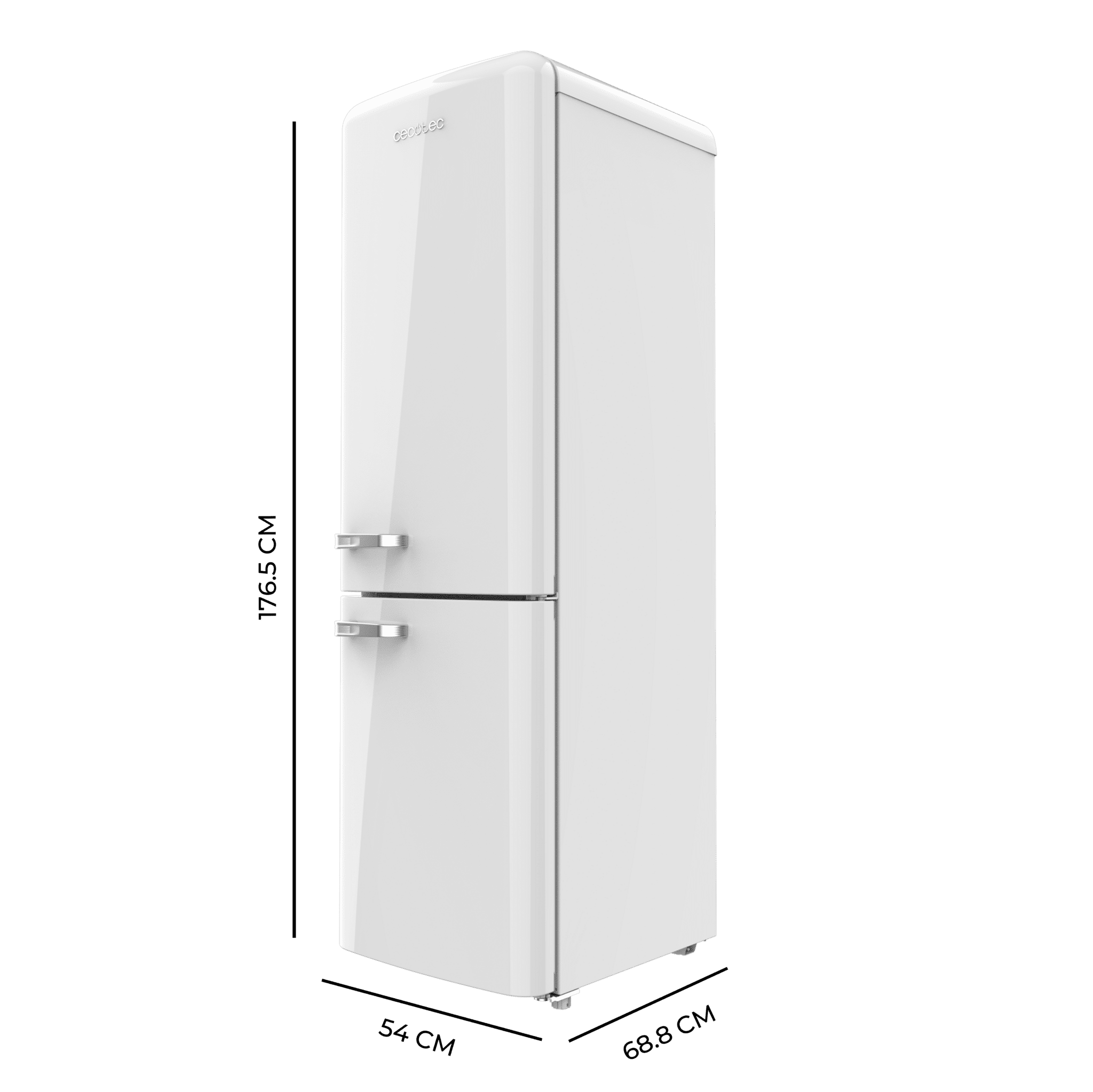 Frigorífico combi retro blanco, 176,5cm alto y 54cm ancho, capacidad 231L, Total No Frost y clase E y con sistema Multi Air Flow. Además, cuenta con el modo Fast Cooling.