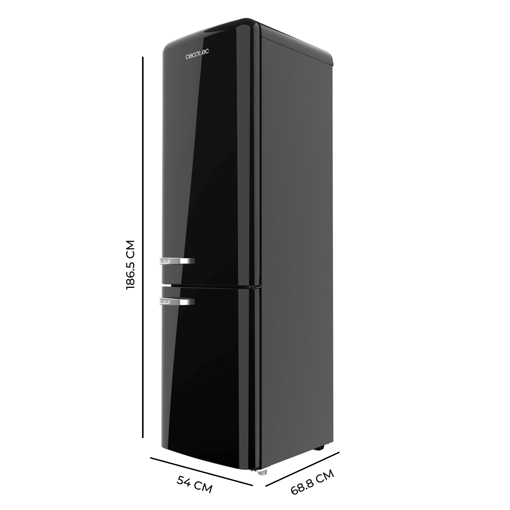 Frigorífico combi retro negro, 186,5cm alto y 54 cm ancho, capacidad 250L, Total No Frost y clase E y con sistema Multi Air Flow. Además, cuenta con el modo Fast Cooling.