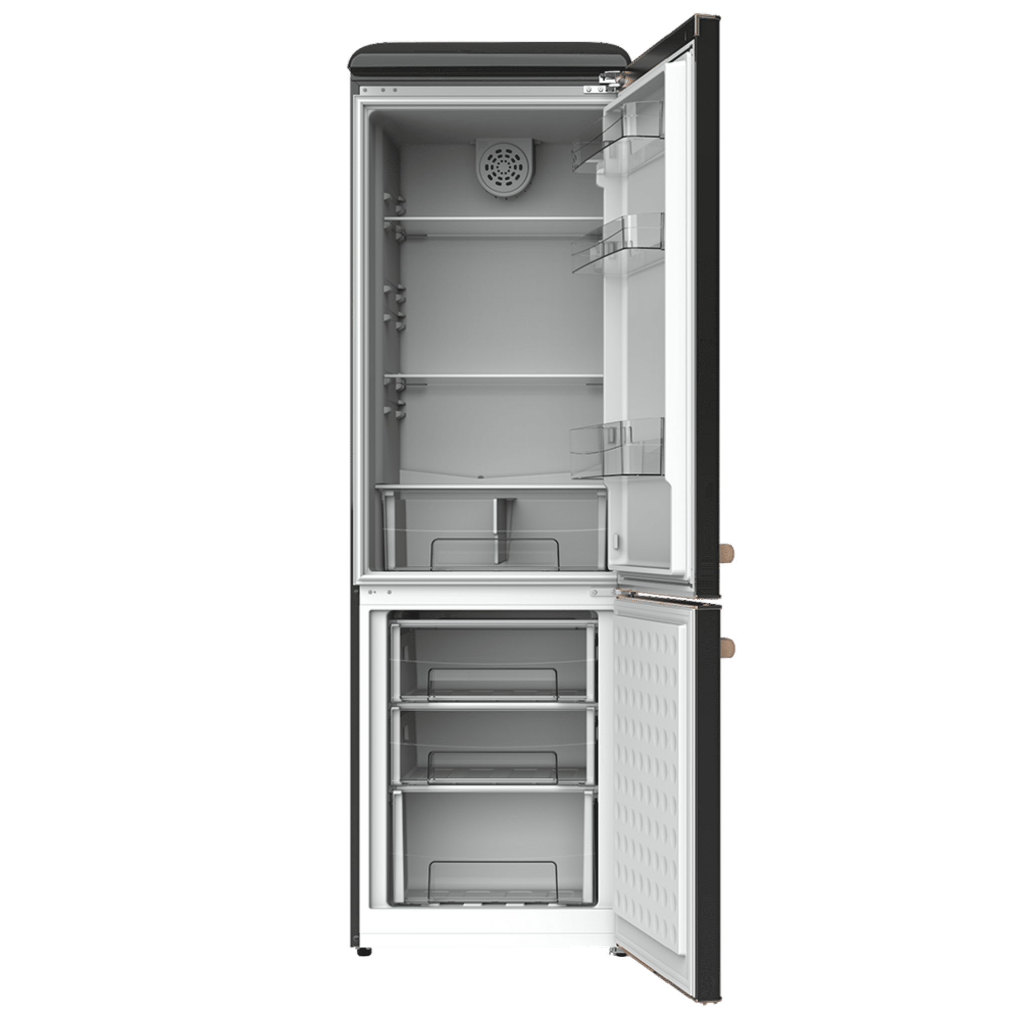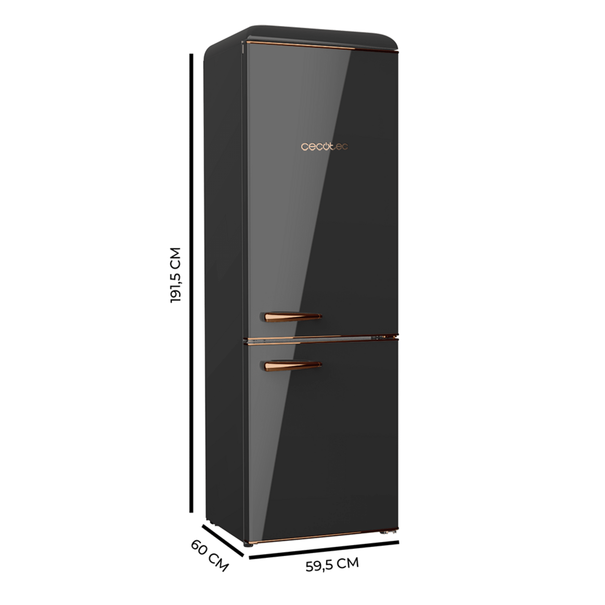 Frigorífico retro combi Origin Black con capacidad de 300L, clase E, LED interior, tirador cromado, bandejas de cristal y abridor de botellines. Ancho 55,9 /Fondo 62,8 /Alto 192cm