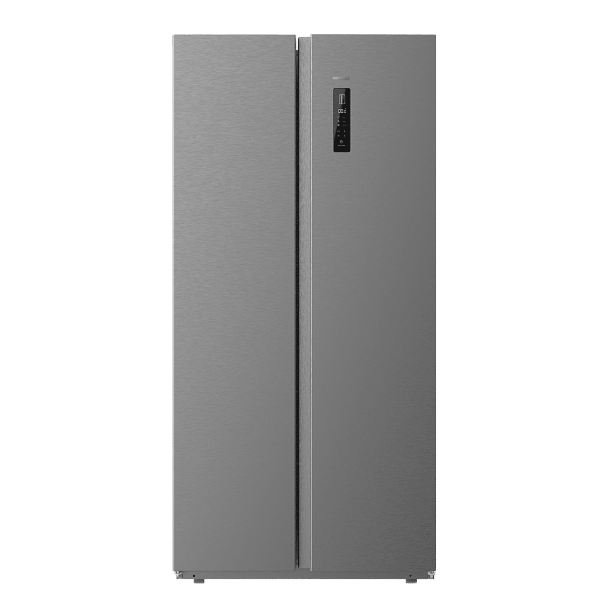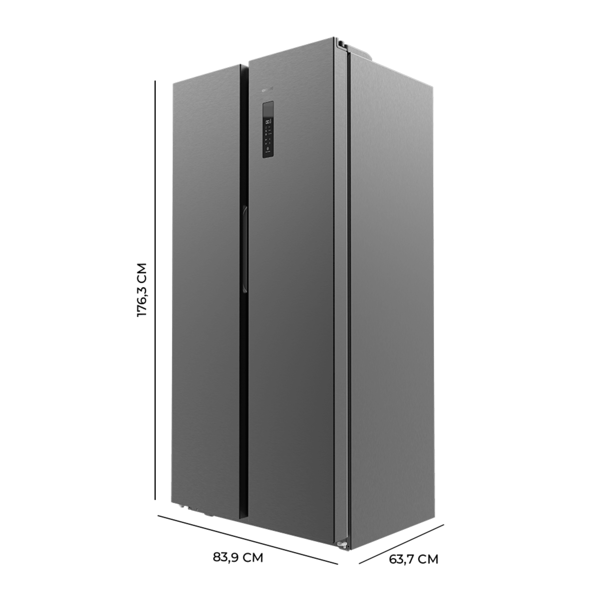 Frigorífico SBS con Capacidad 430 L. Multi Airflow. Total No Frost. Humidity/Crisper box, LED interior, Alarma de puerta, Control de temperatura, Inverter Plus. Modo eco, Modo vacaciones, fast freezing y cooling, Display en la puerta. Color Dark inox Clasifición energética E. Ancho 83,9 /Fondo 63,7 /Alto 176,3cm