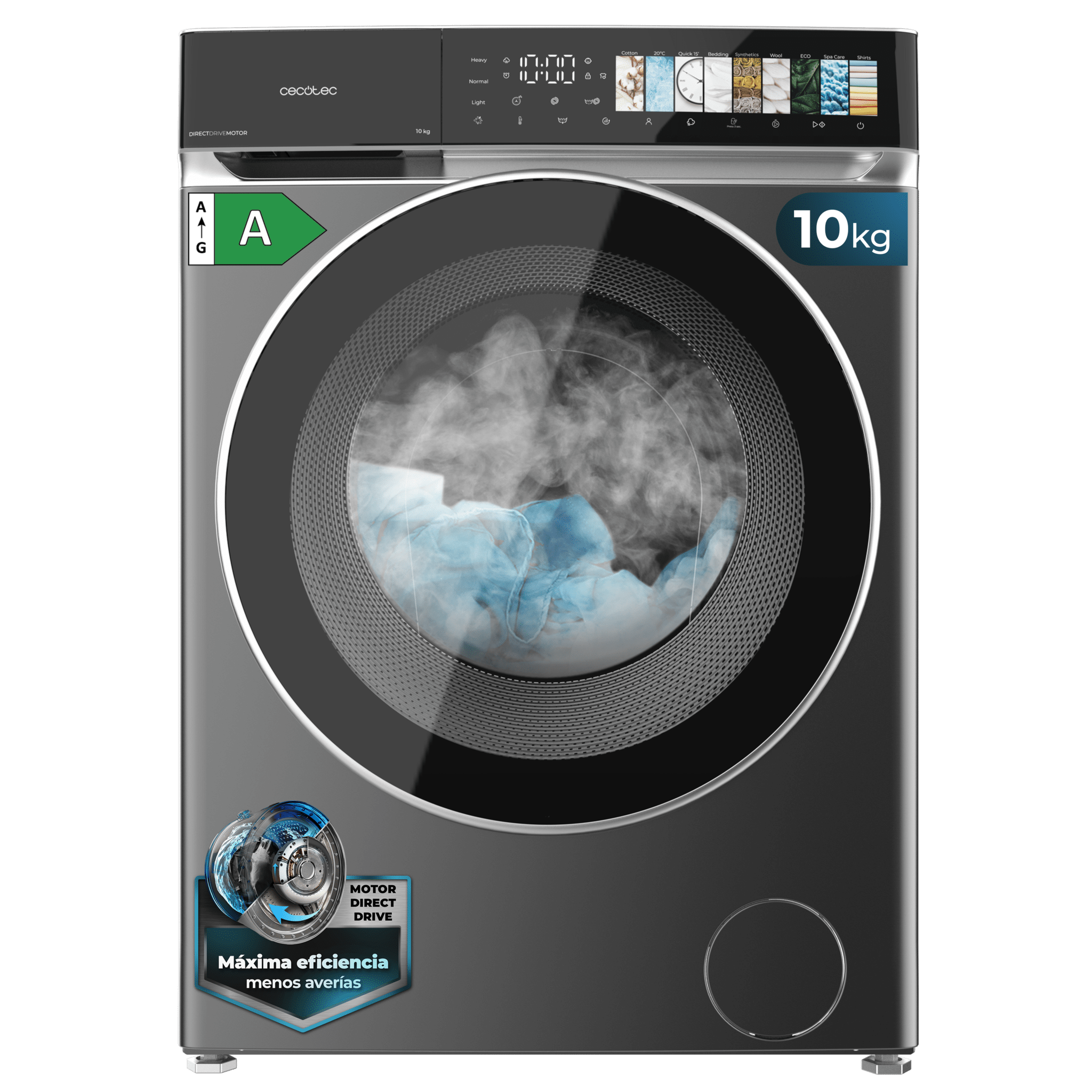 Lavadora de 10 kg color steel y clase A, con motor Direct Drive y 1400 rpm, 11 programas, pantalla FullColor, puerta XXL y función vapor SteamMax, Spa Care, Soil Level, Delay End, My Fav, luz interior, Drum Clean Plus y Stop&Go