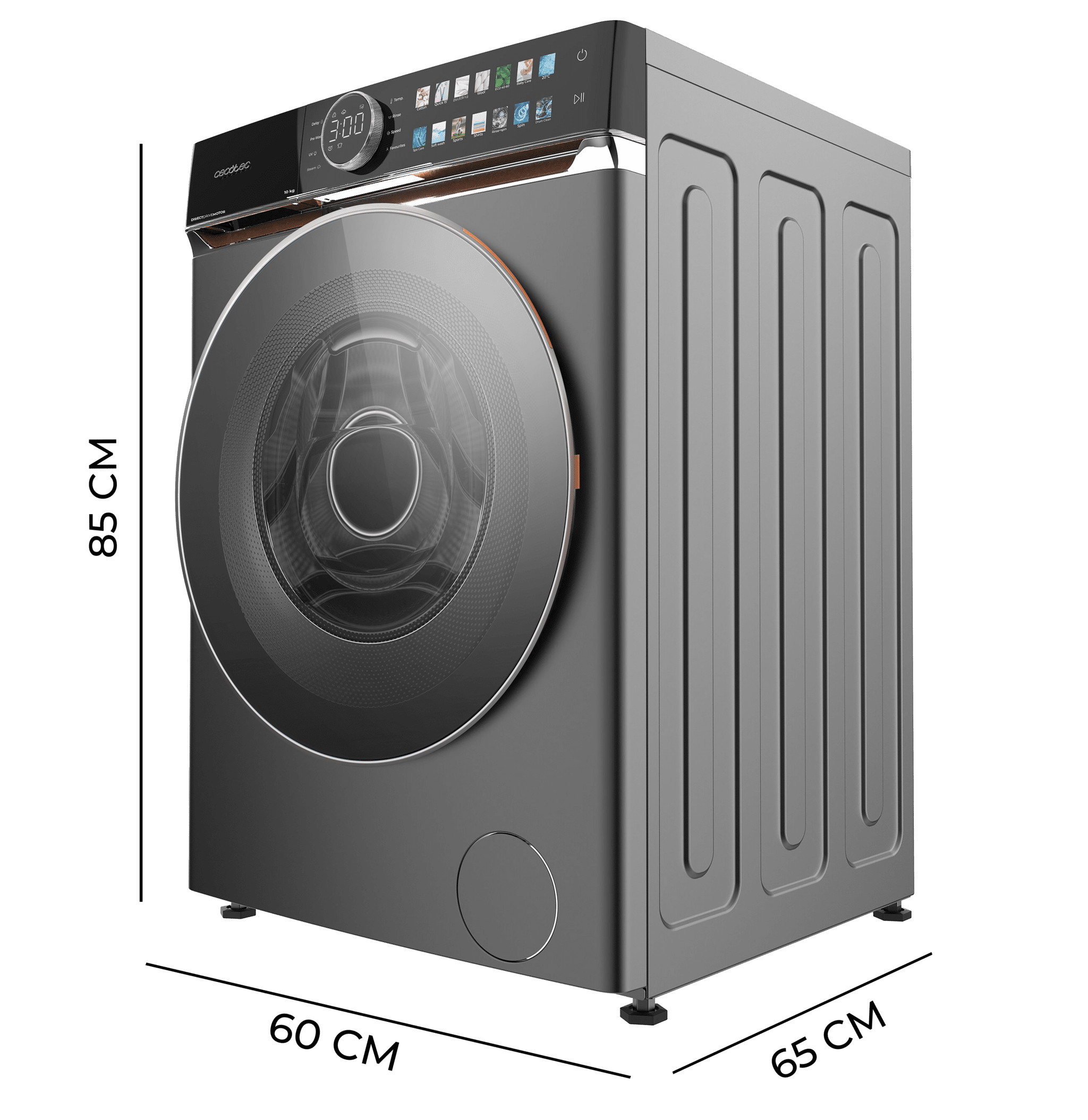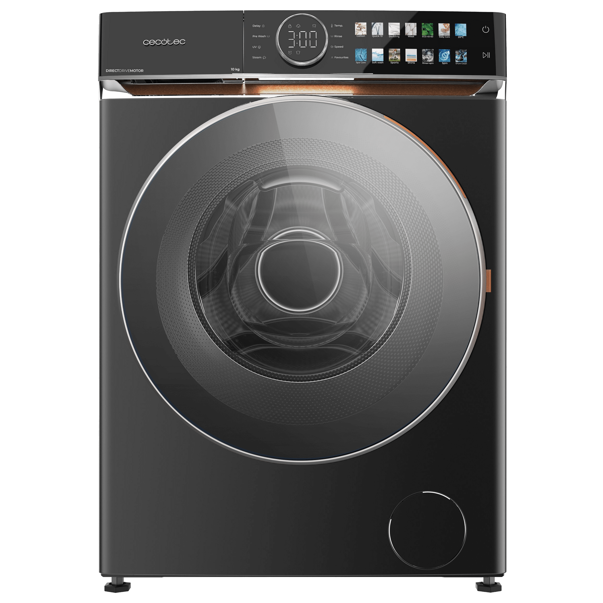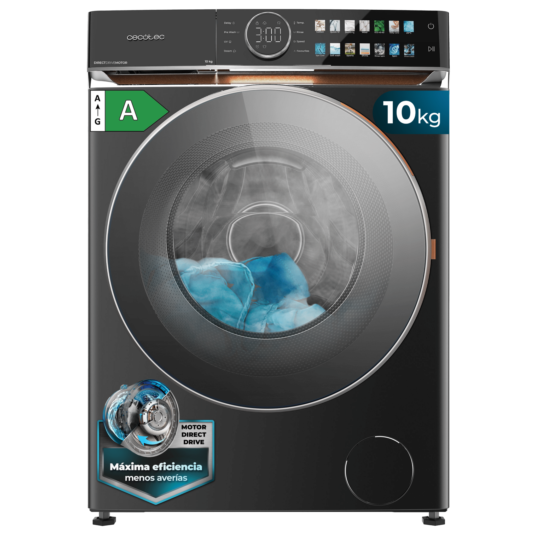 Lavadora de 10 kg color Steel y clase A, con motor Direct Drive y 1400 rpm. Con diseño Display Full Colour con knob TFT y acabados en imitación cuero, puerta XXL, Luz Interior UV y funciones SteamMax, Spa Care, Delay End, Stop&Go, Drum Clean, Door Look y My Fav