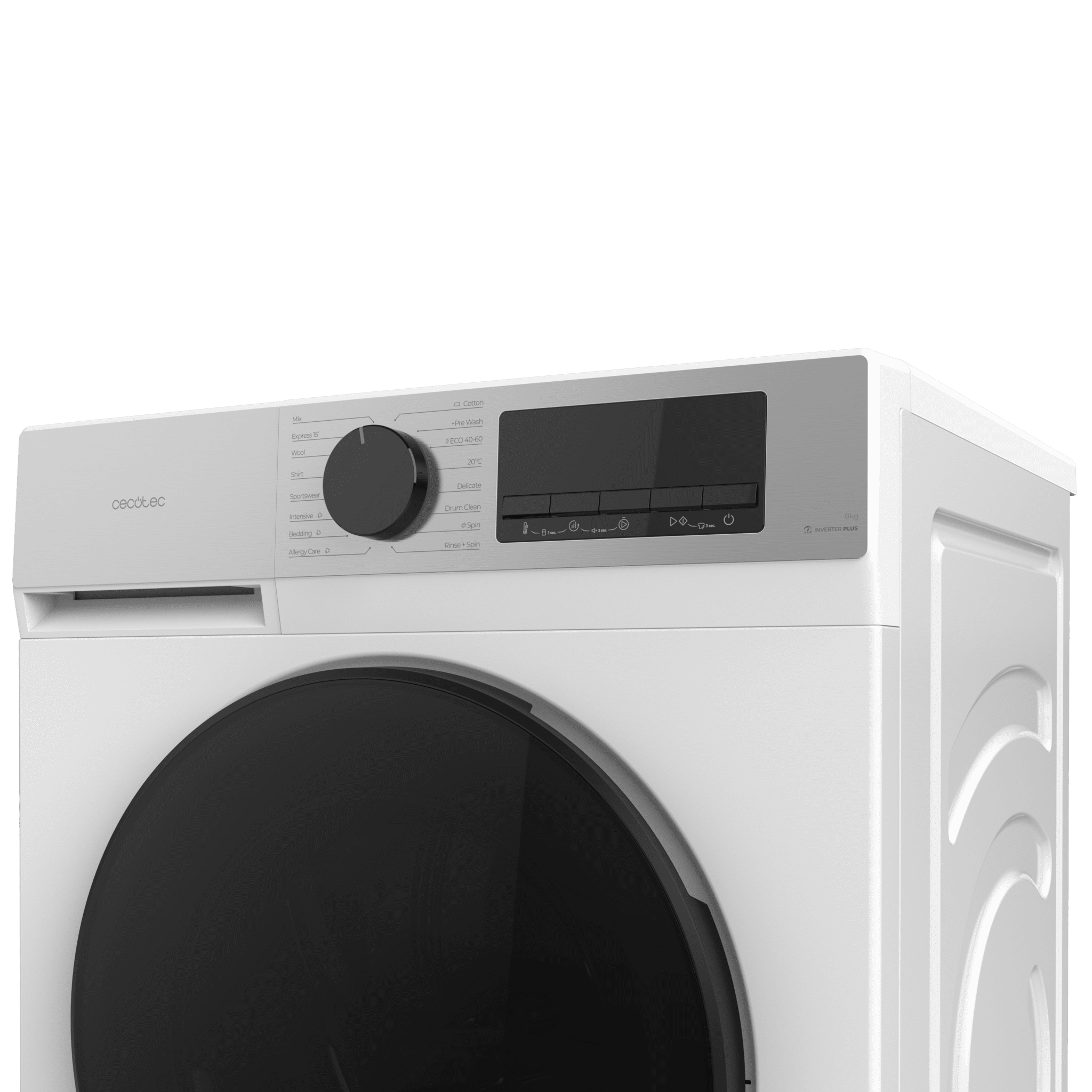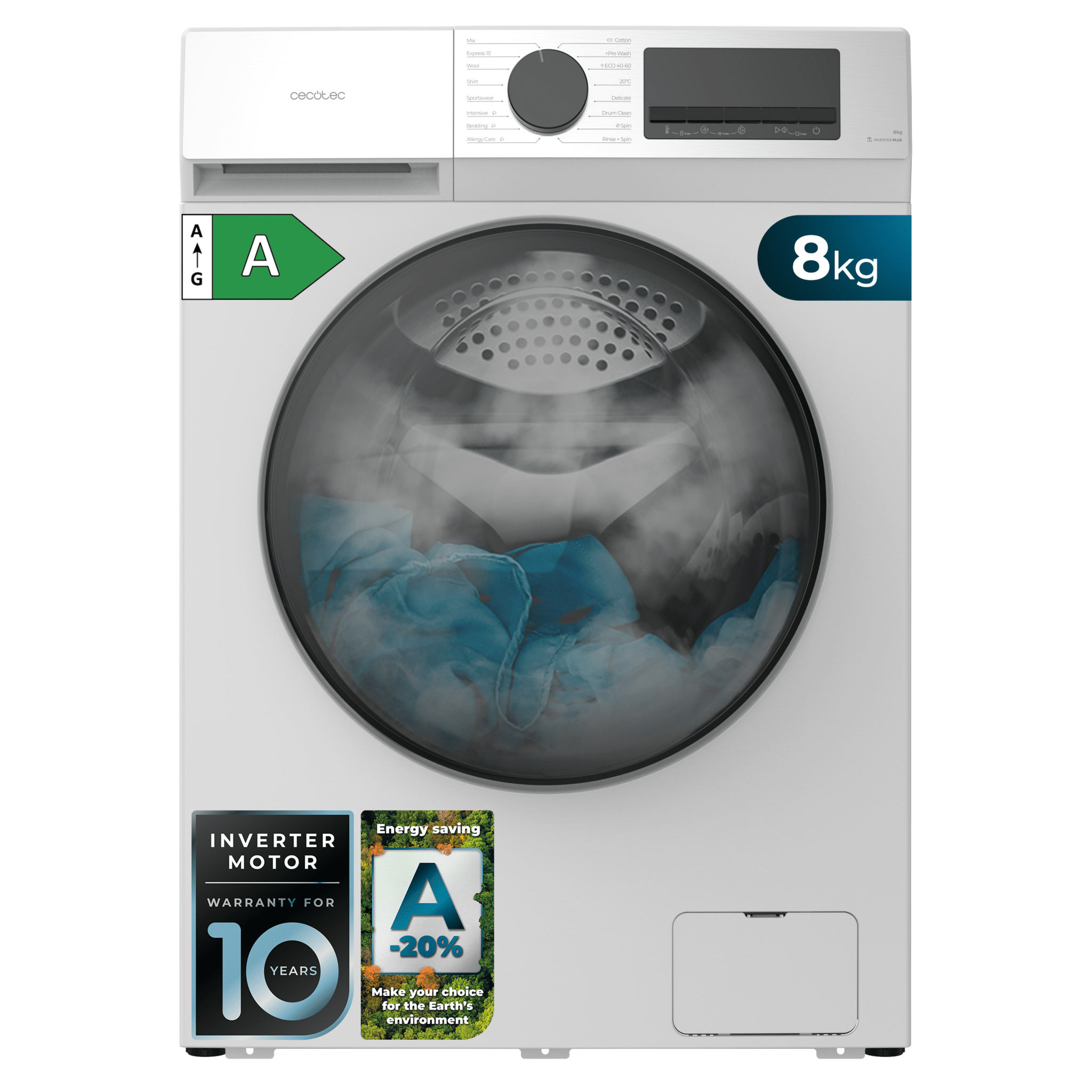 Lavadora blanca de 8 kg de capacidad y 1400 rpm, 16 programas, Clase A-20 %, motor Inverter Plus, elegante panel inox, SteamMax, Drum Clean, Allergy Care, Pearl Drum, Delay Start, Función Silence, Stop&Go y Kid Lock.