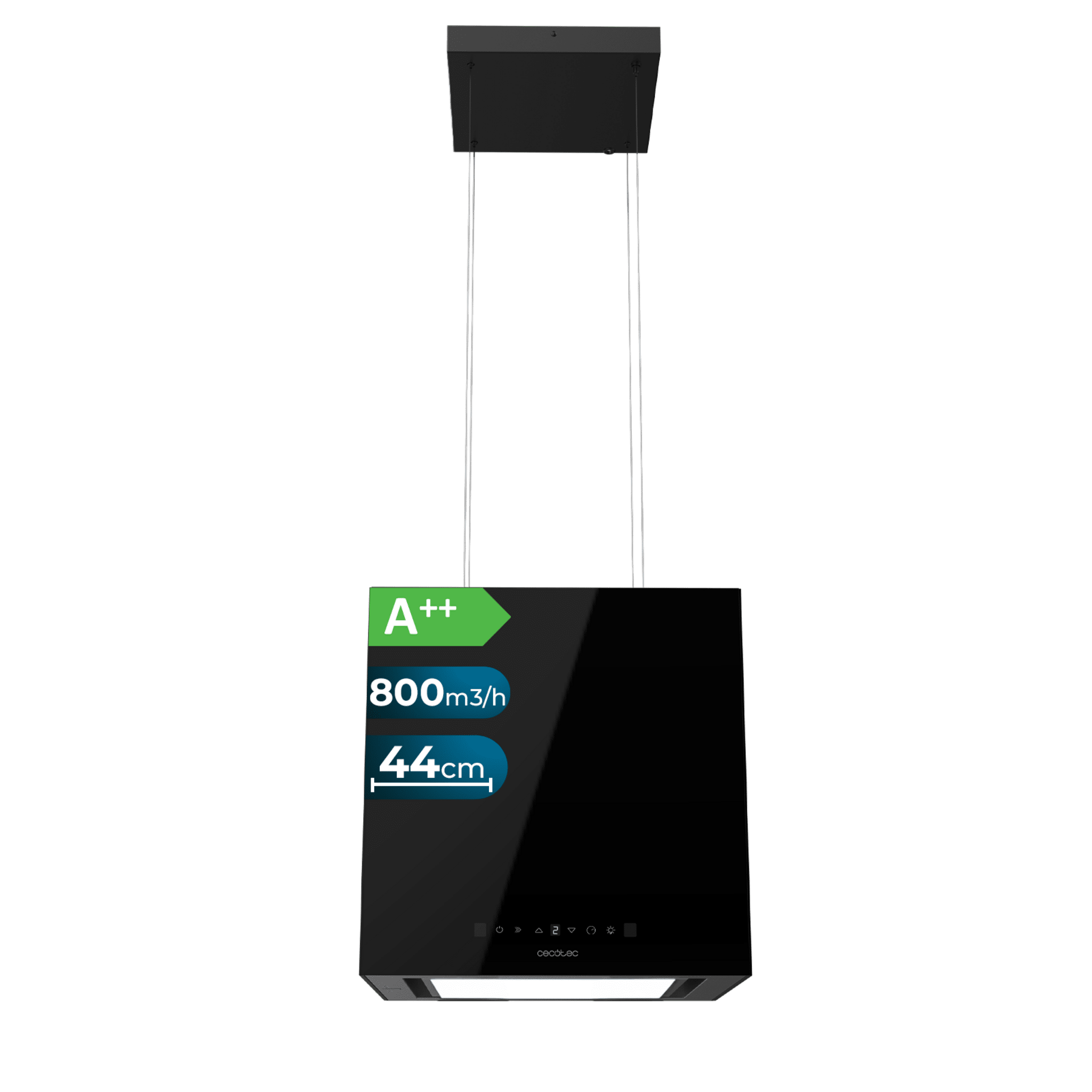 Campana colgante cuadrada Bolero Flux CCT 448000 Glass Black A++ de 44cm de ancho, acabado vidrio negro, succión 800m3/h, Motor 220W, Clase A++, control táctil, 3 niveles de potencia, Booster, luz, filtro de carbono, Hand Movement Control y Smoke sensor.