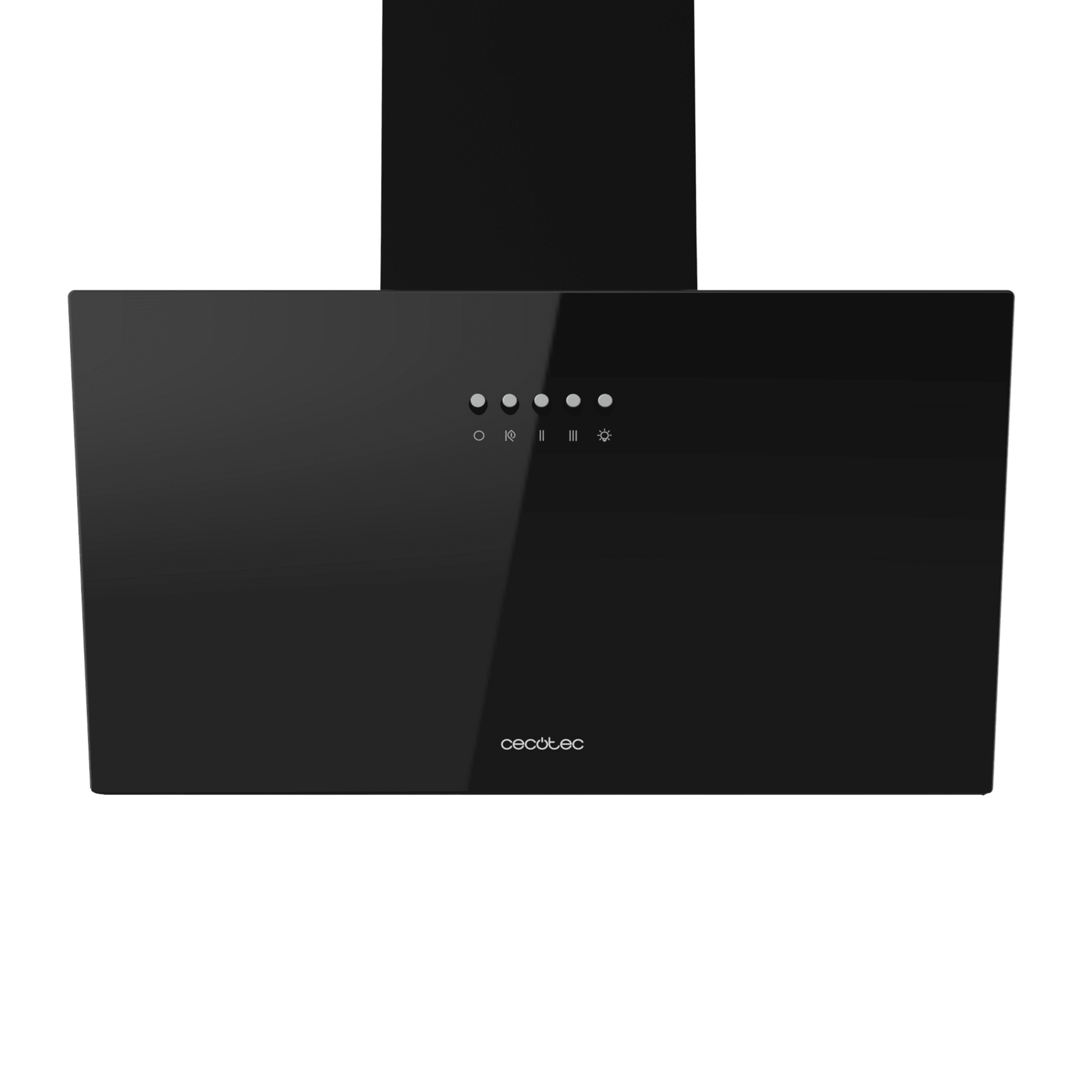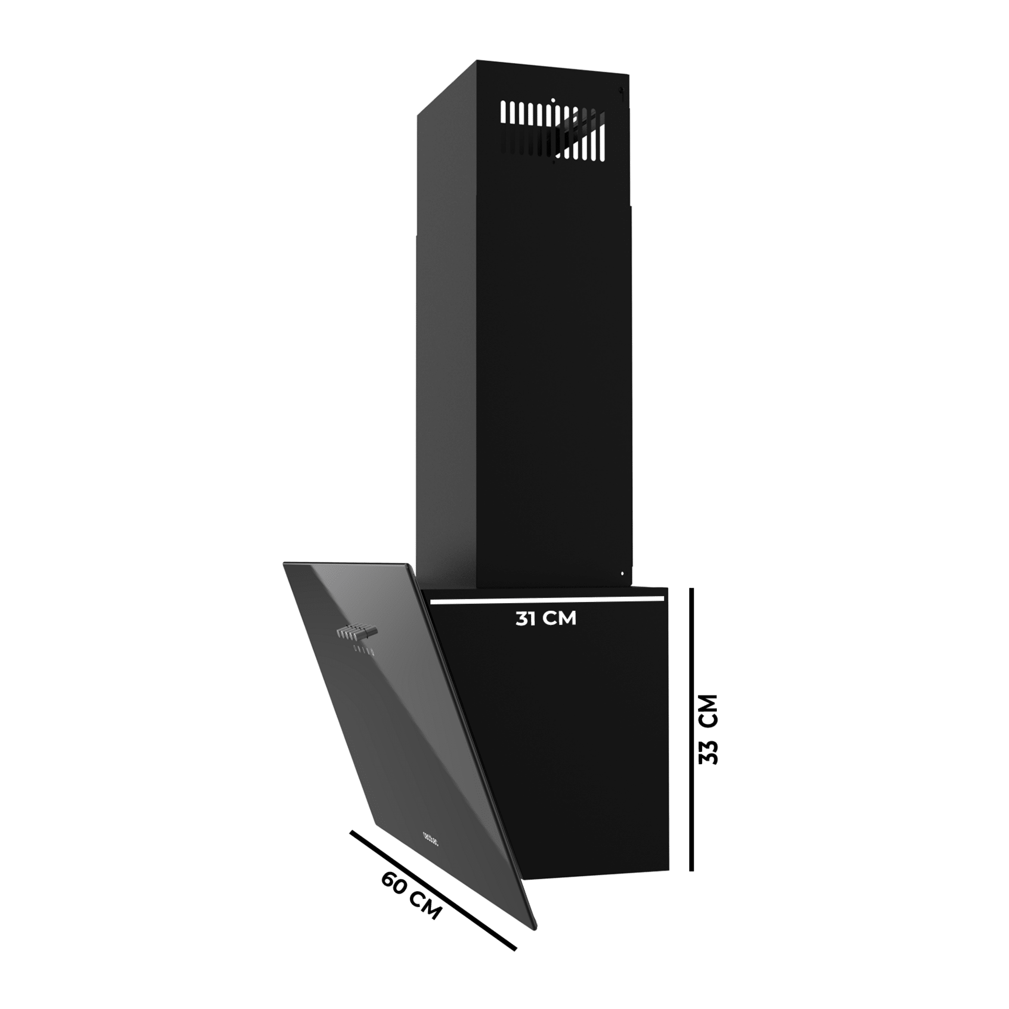 Campana decorativa Bolero Flux DM 603500 Glass Black B de 60cm de ancho, acabado frontal vidrio negro, succión 350m3/h, Motor 65W, Clase B, control mecánico, 3 niveles de potencia, luz y filtro de carbono.