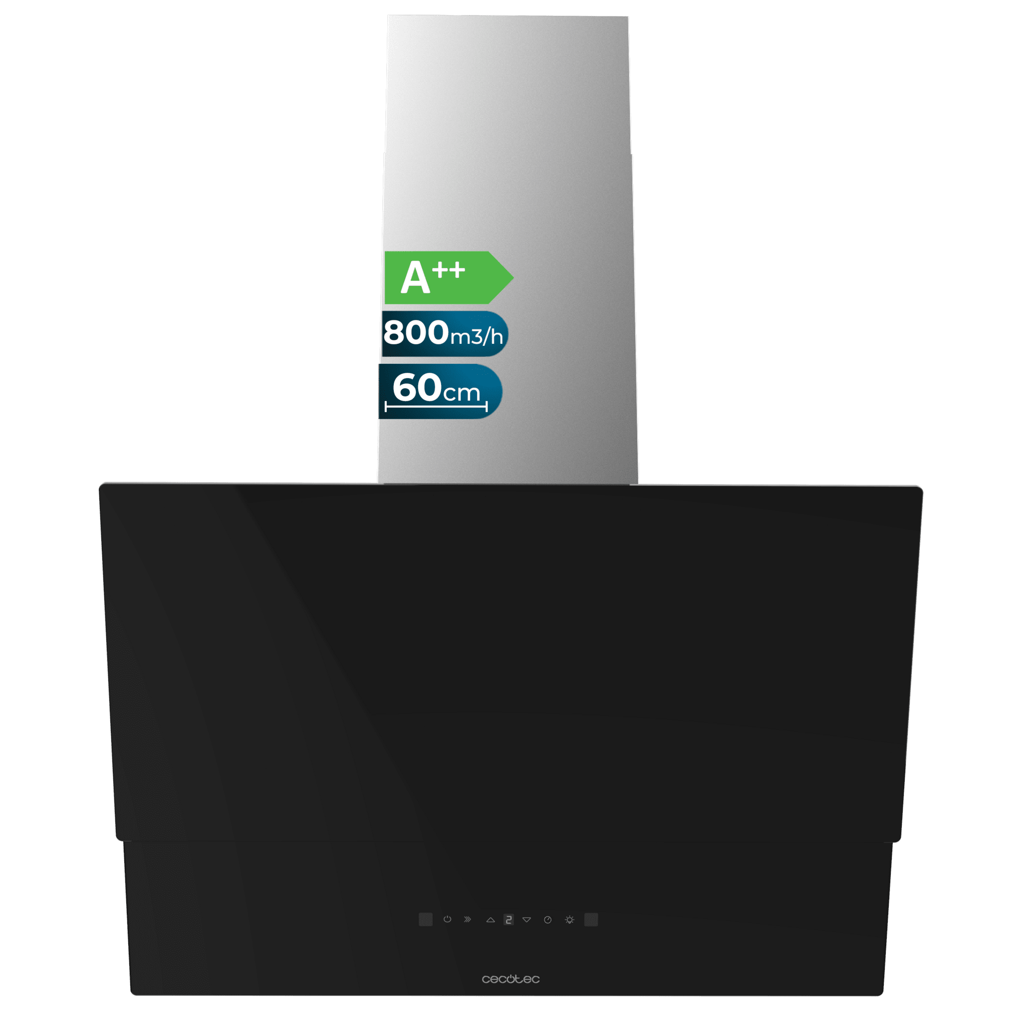 Campana decorativa Bolero Flux DT 608001 Glass Black A++ de 60 cm de ancho, acabado frontal vidrio negro, chimenea inox, succión 800m3/h, Motor 220W, Clase A++, control táctil, 3 niveles de potencia, Booster, luz, filtro de carbono y Hand Movement Control.