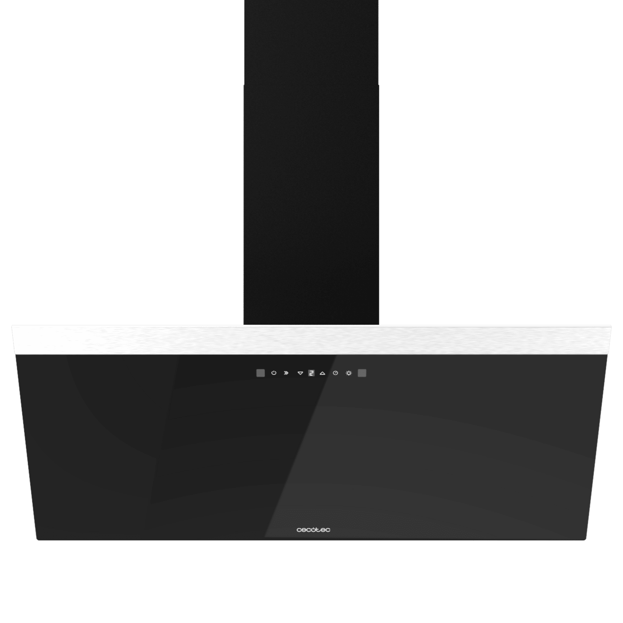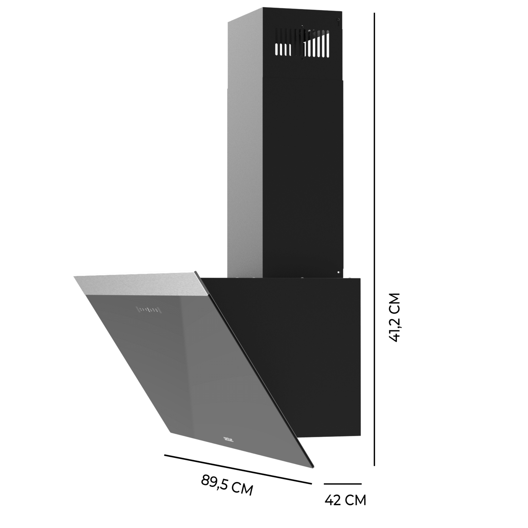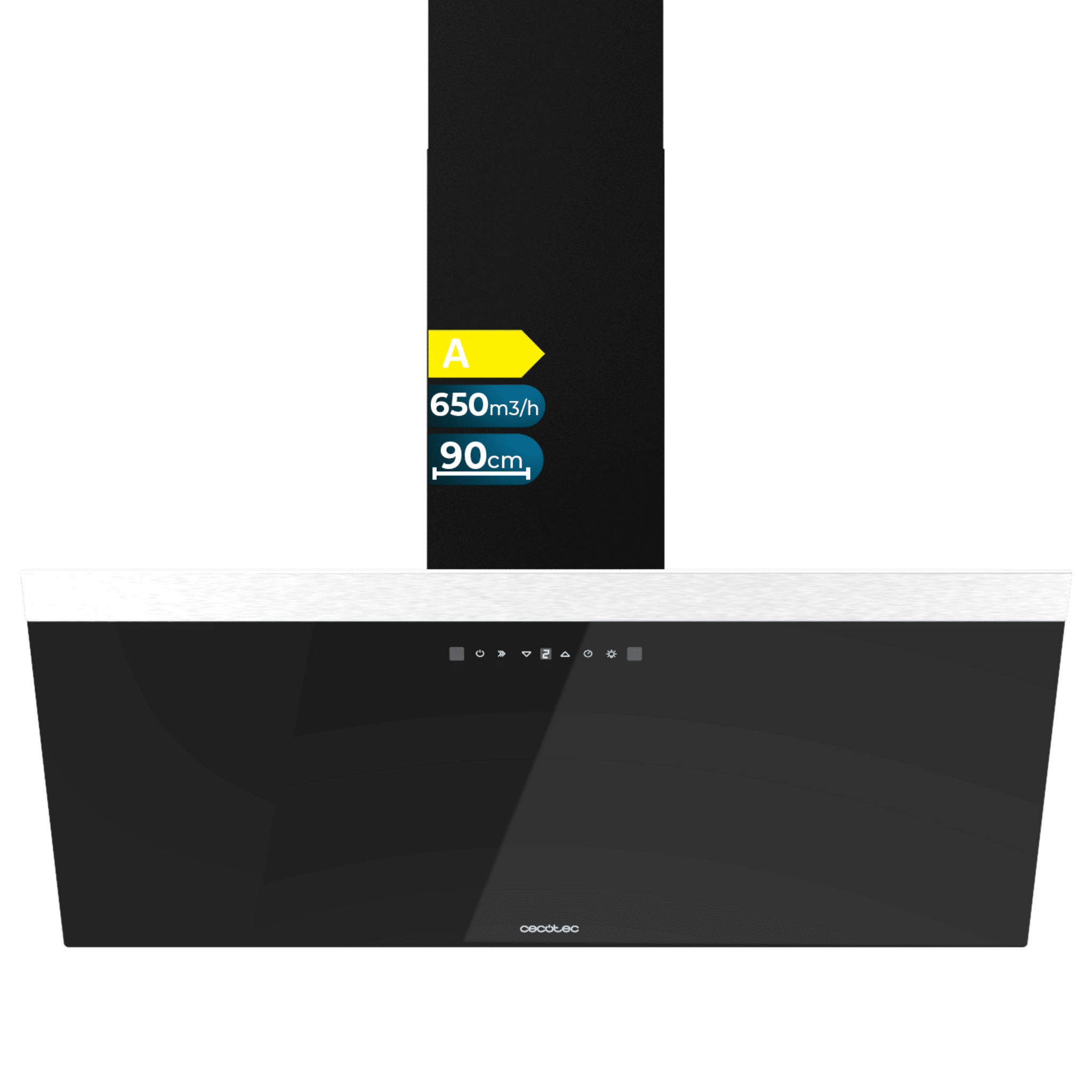Campana decorativa Bolero Flux DT 906500 Glass Black A de 90cm de ancho, acabado frontal vidrio negro, chimenea negra, succión 650m3/h, Motor 165W, Clase A, control táctil, 3 niveles de potencia, Booster, luz, filtro de carbono y Hand Movement Control.