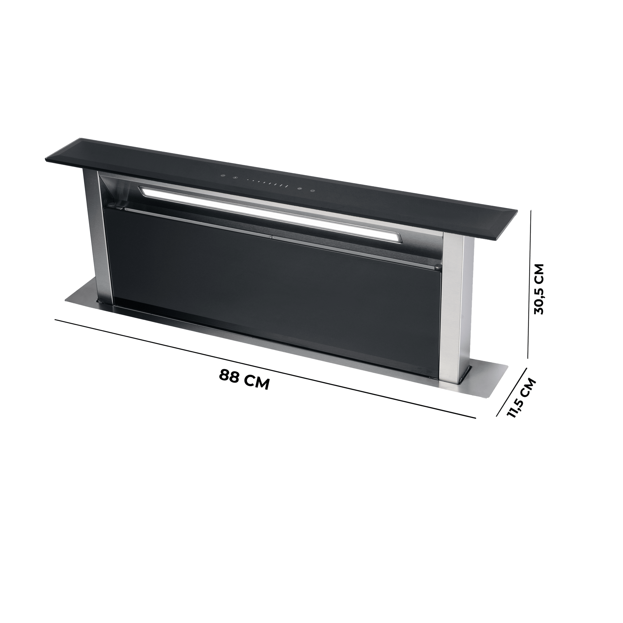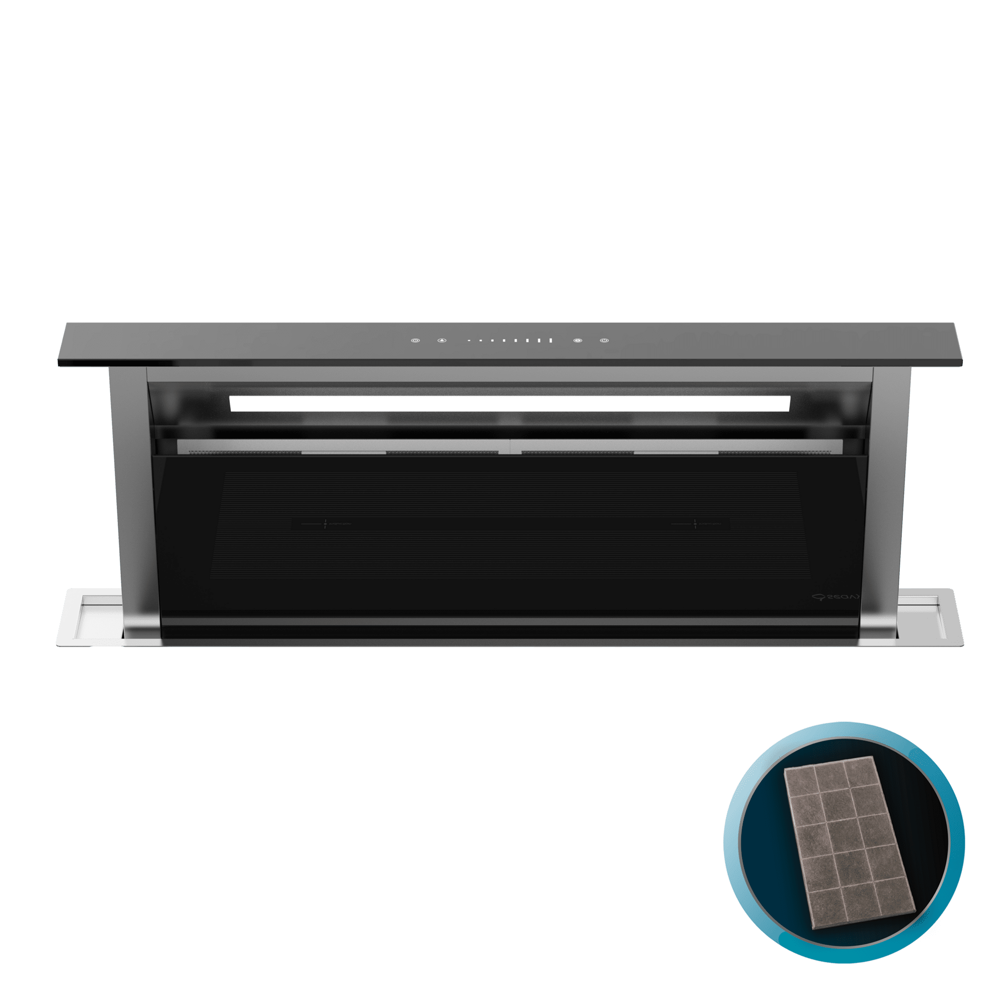 Campana extraíble de encimera Bolero Flux ET 908000 Glass Black A++ de 90cm de ancho, acabado vidrio negro, succión 800m3/h, Motor 220W, 3 niveles de pontencia, Booster, slider control, luz y filtro de carbono.