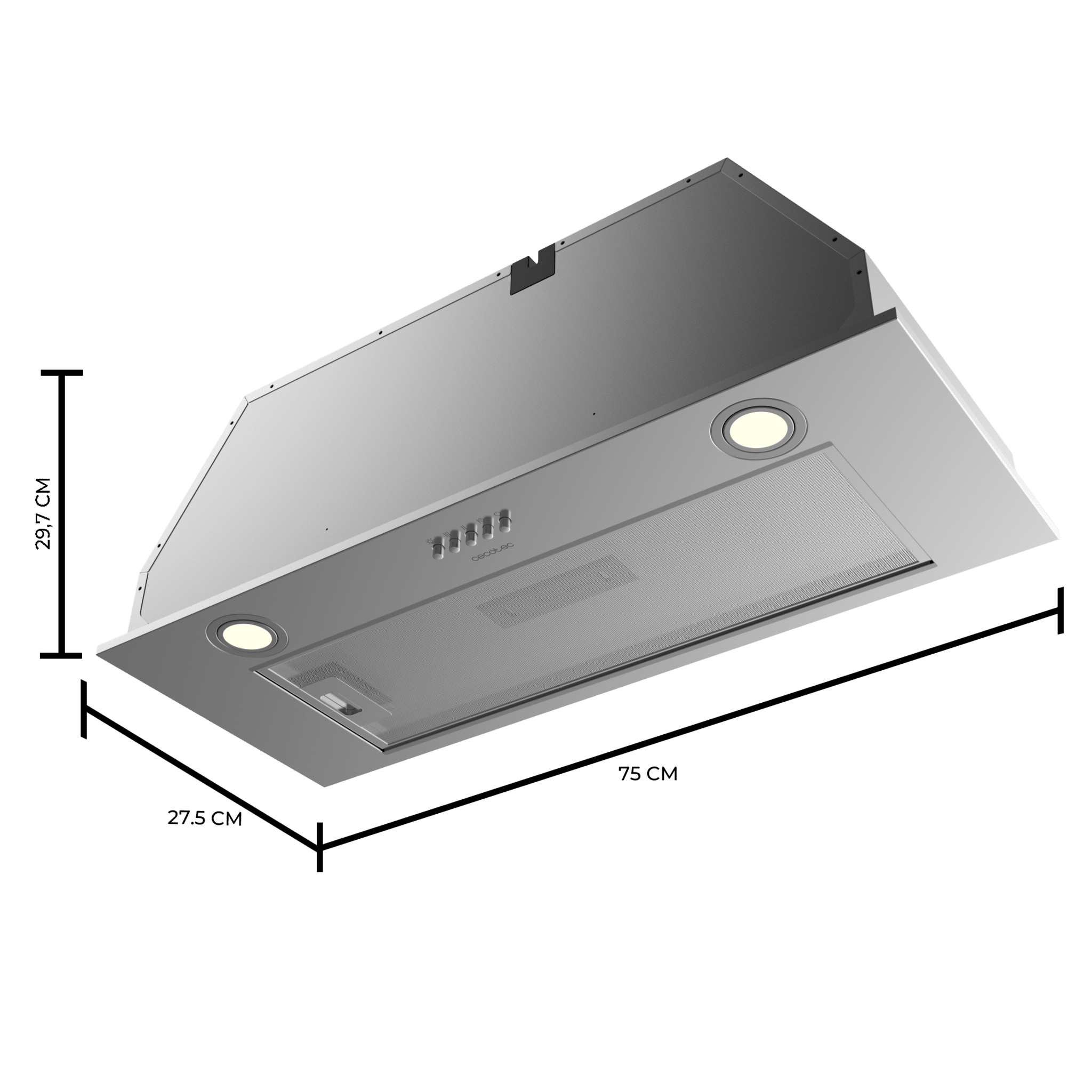 Campana integral Bolero Flux IM 756500 Inox A de 75cm de ancho, acabado inox, potencia succión 650m3/h, Motor 165W, Clase A, control mecánico, 3 niveles de potencia, Luz y filtro de carbono.