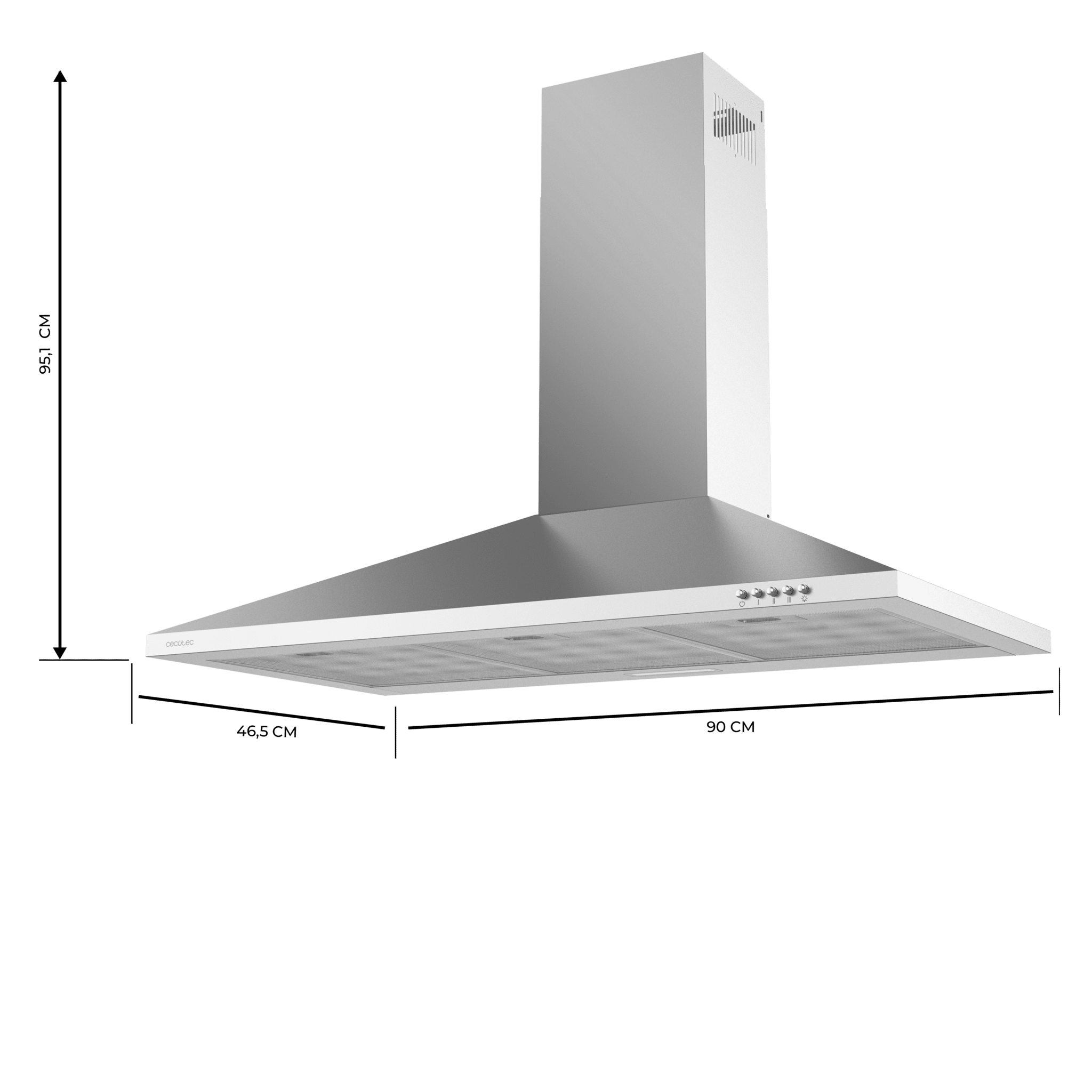 Campana piramidal Bolero Flux PM 903500 Inox B de 90cm de ancho, acabado inox, succión 350m3/h, Motor 65W, Clase B, control mecánico, 3 niveles de potencia, luz y filtro de carbono.