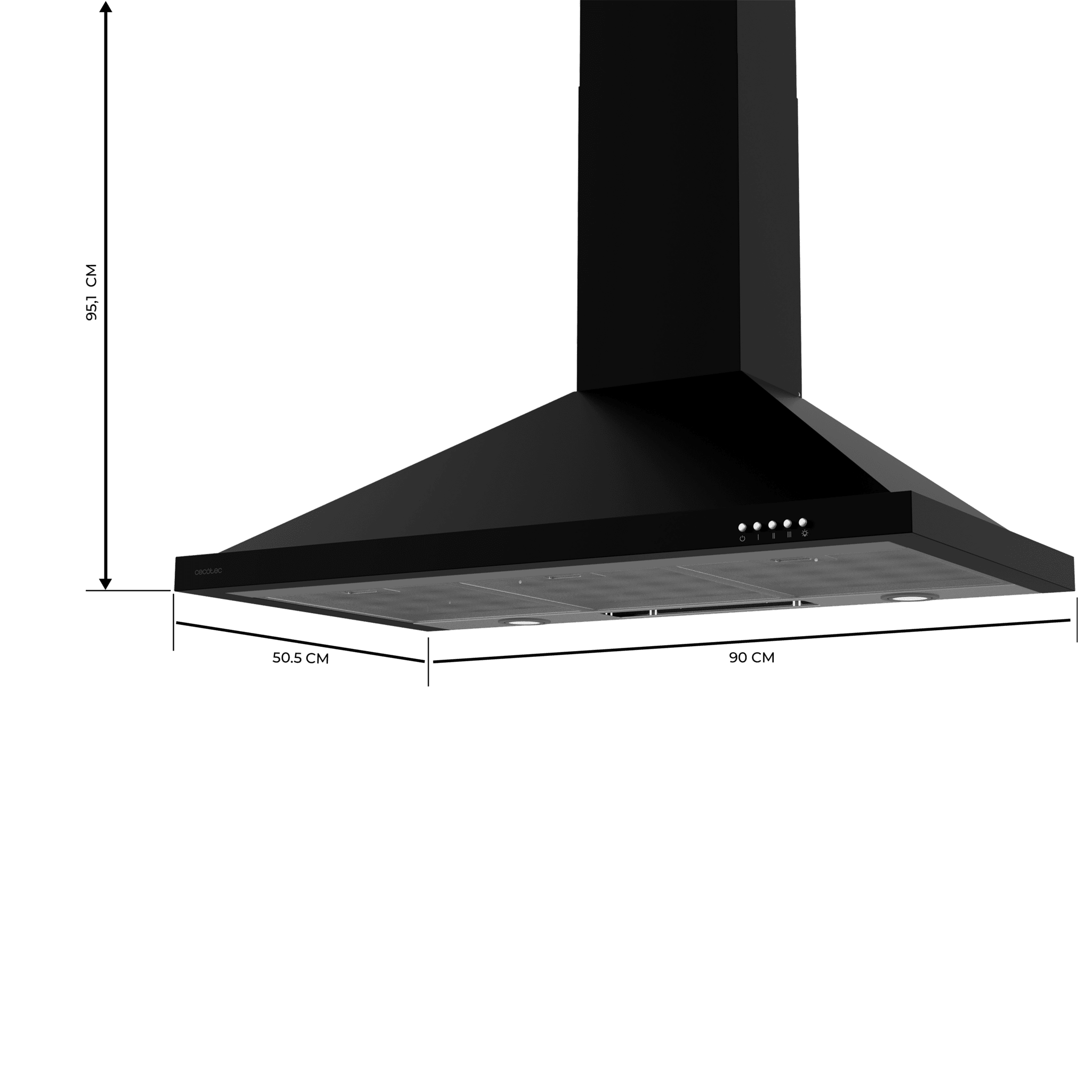 Campana piramidal Bolero Flux PM 906500 Black A de 90cm de ancho, acabado negro, succión 650m3/h, Motor 165W, Clase A, control mecánico, 3 niveles de potencia, luz y filtro de carbono.