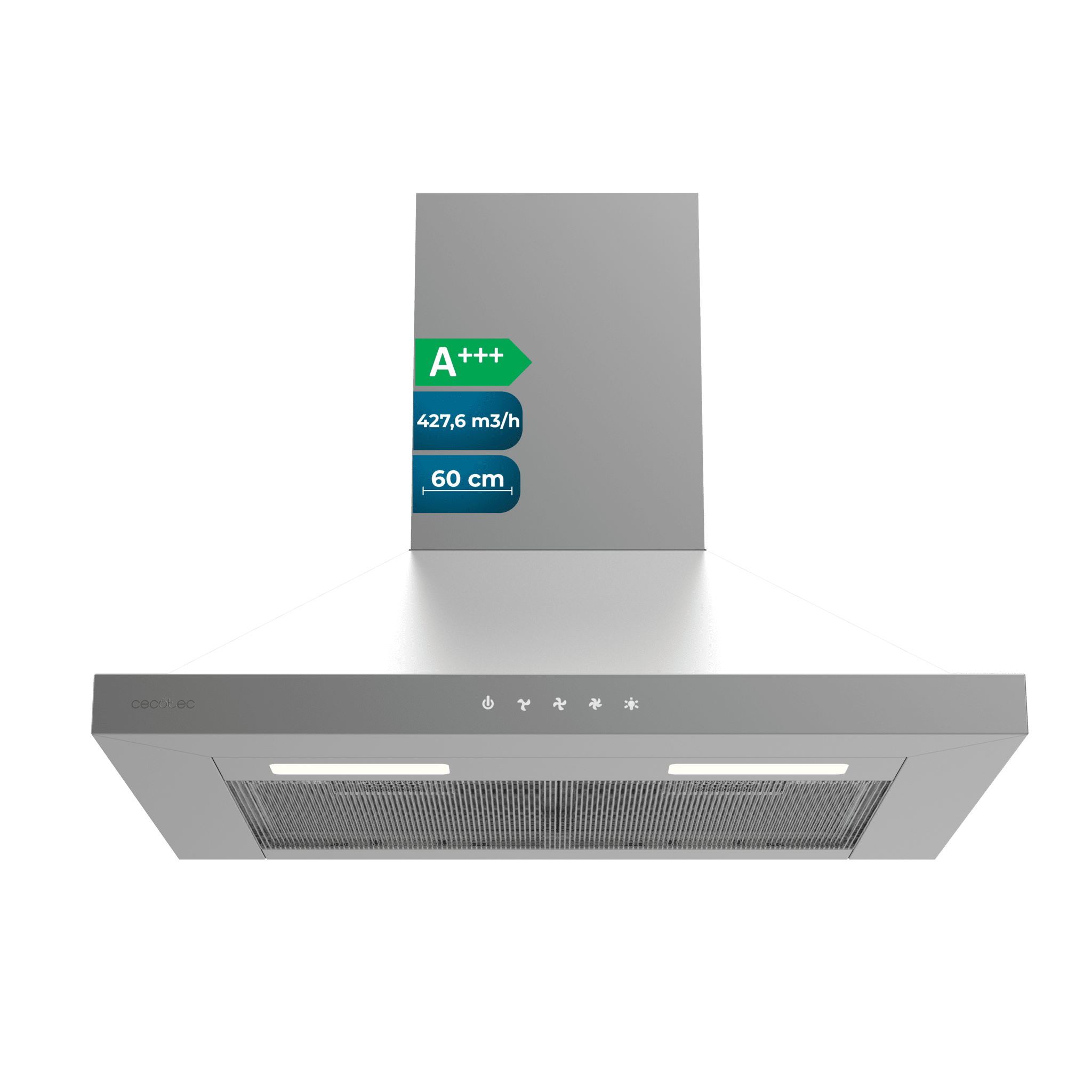 Cecotec Bolero Flux PT 604000 Inox A+++ – Campana extractora Piramidal de 60cm, Succión 427,6m3/h, Clase A++, SS Touch Control, Inoxidable, 3 Velocidades, Motor DC, Luz LED, Filtros de Aluminio y Filtros de Carbono incluidos.