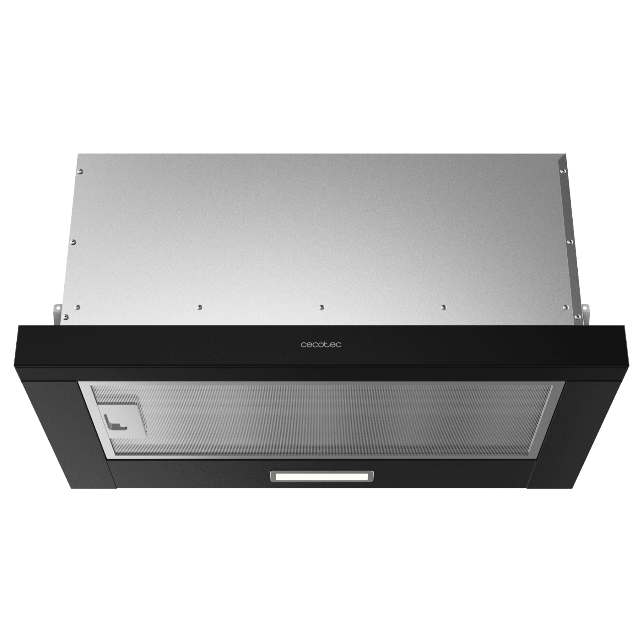 Campana extractora telescópica Flux TLM 603500 Black A de 60cm de ancho, acabado negro, potencia succión 350m3/h, Motor 70W, Clase A, control mecánico, 3 niveles de potencia y filtro de carbono.