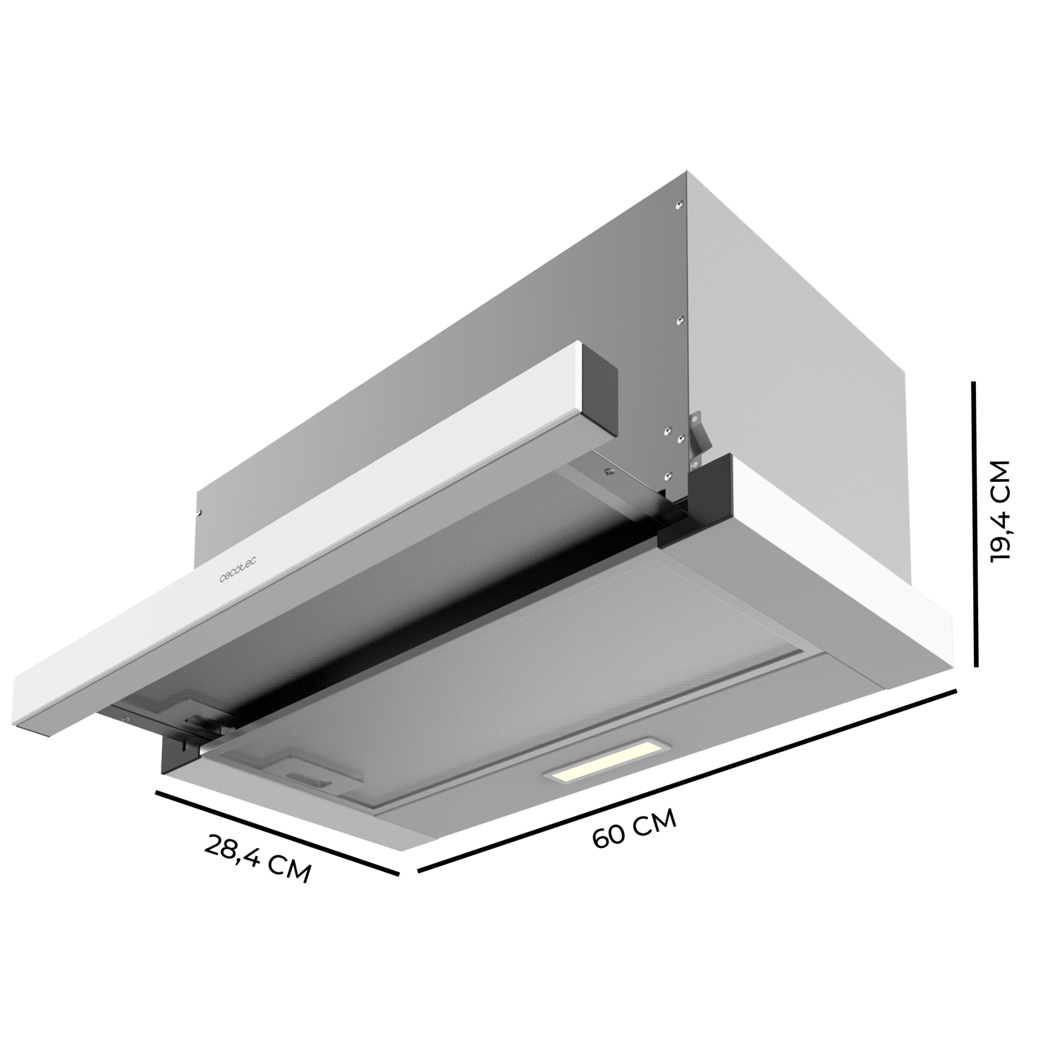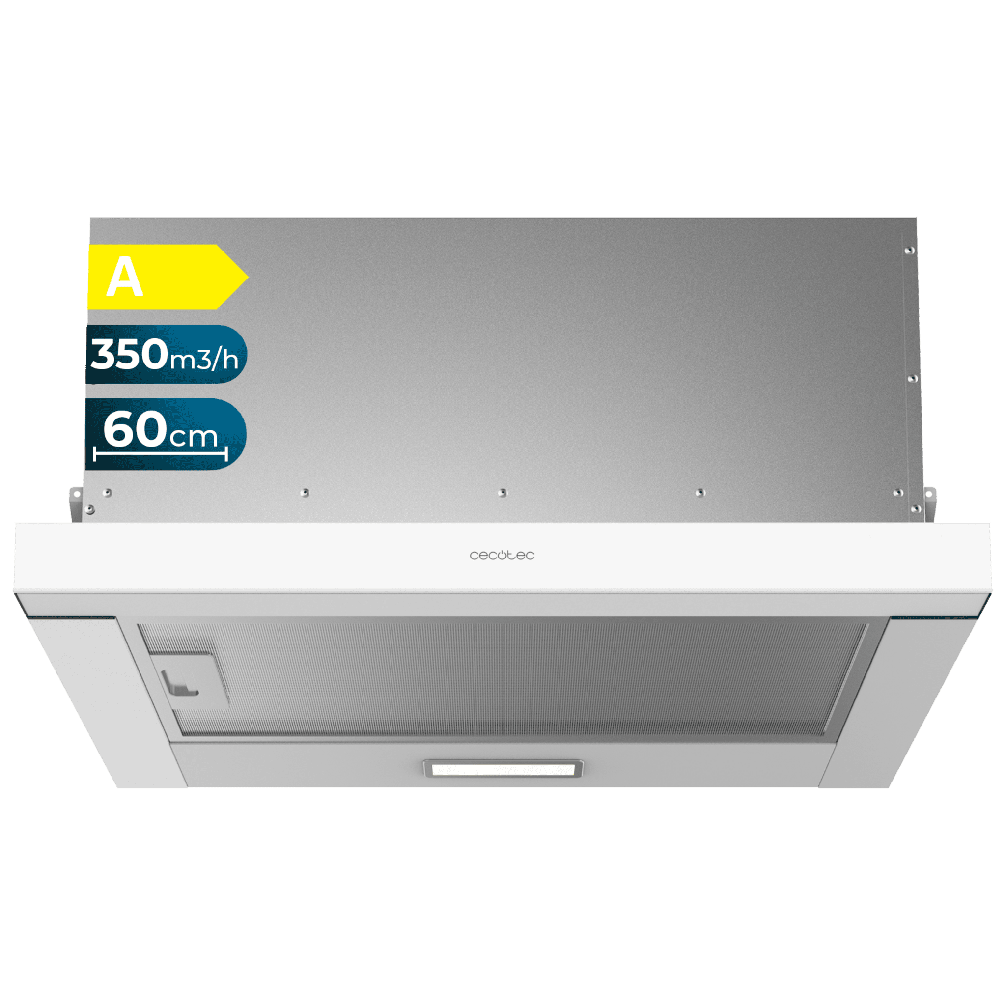 Campana extractora telescópica Flux TLM 603500 White A de 60cm de ancho, acabado blanco, potencia succión 350m3/h, Motor 70W, Clase A, control mecánico y 3 niveles de potencia.