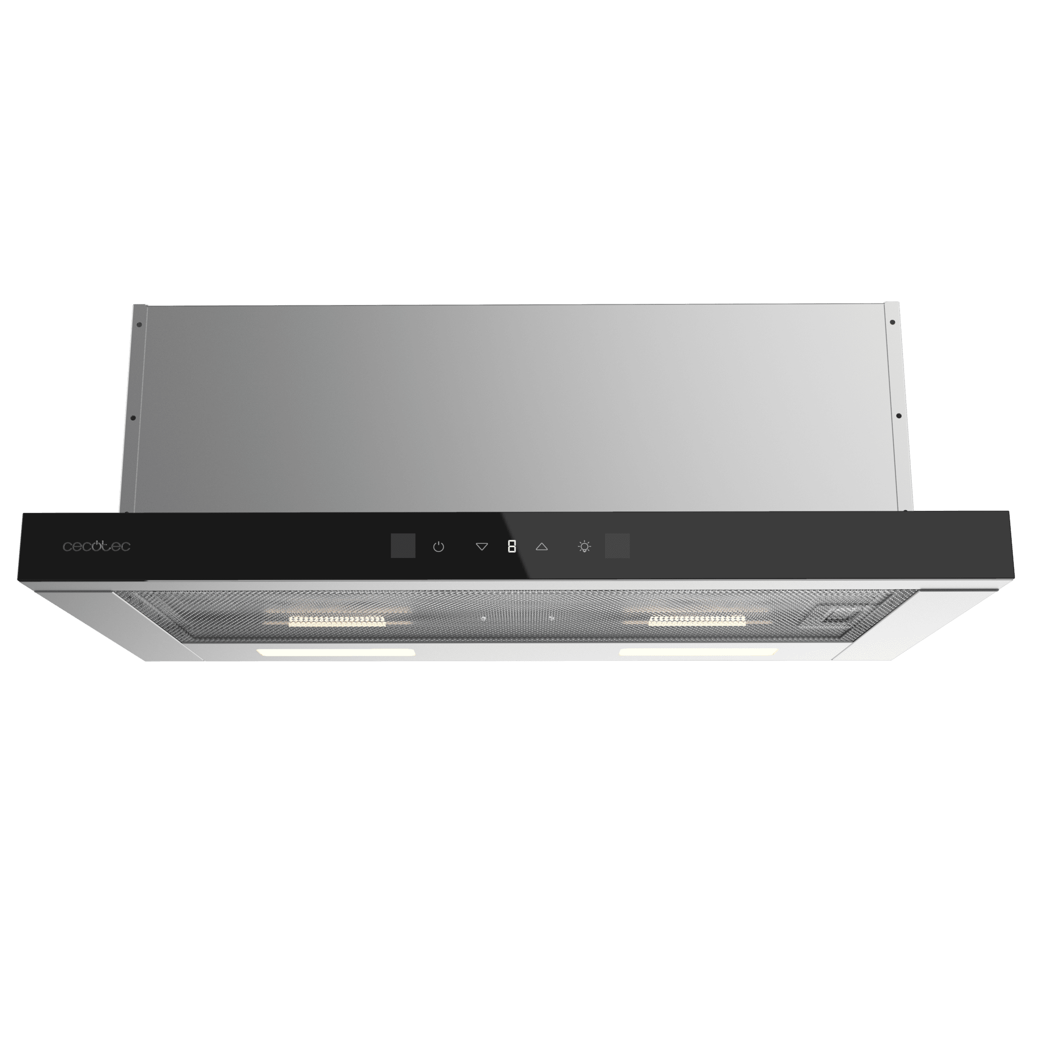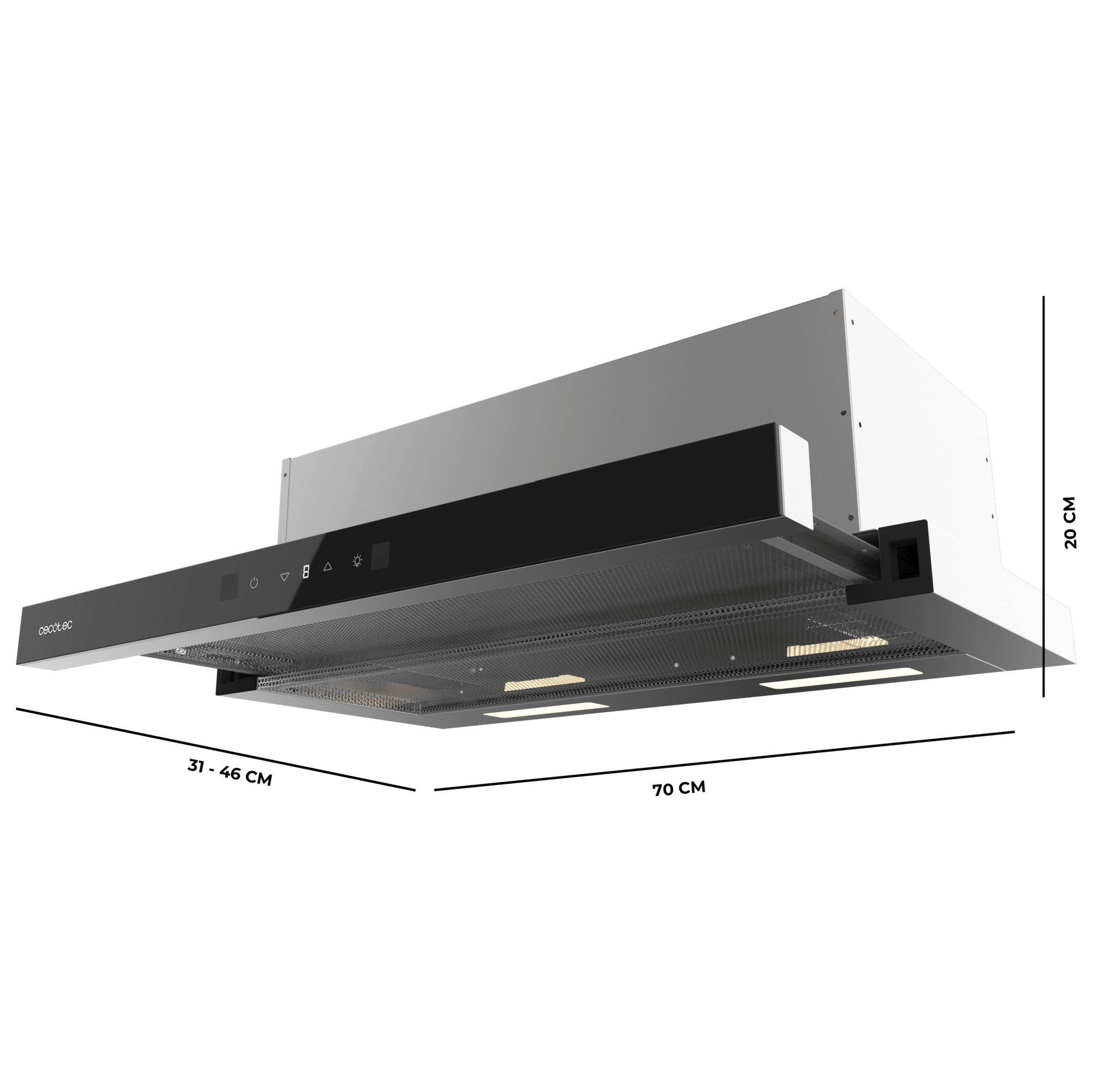 Cecotec Bolero Flux TLT 604400 Glass Black A+++ Campana Extractora Telescópica de 60cm, Succión 431,2m³/h, Clase A+++, Control Táctil Invisible, Cristal Negro, Cuerpo Acero Inox, Motor DC, Hand Movement Control, Función Booster, Filtros de aluminio, Opción de filtros de carbono incluídos.