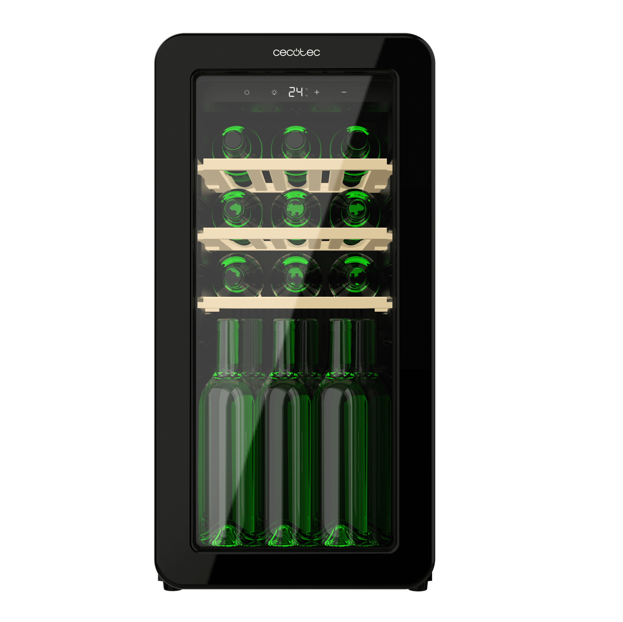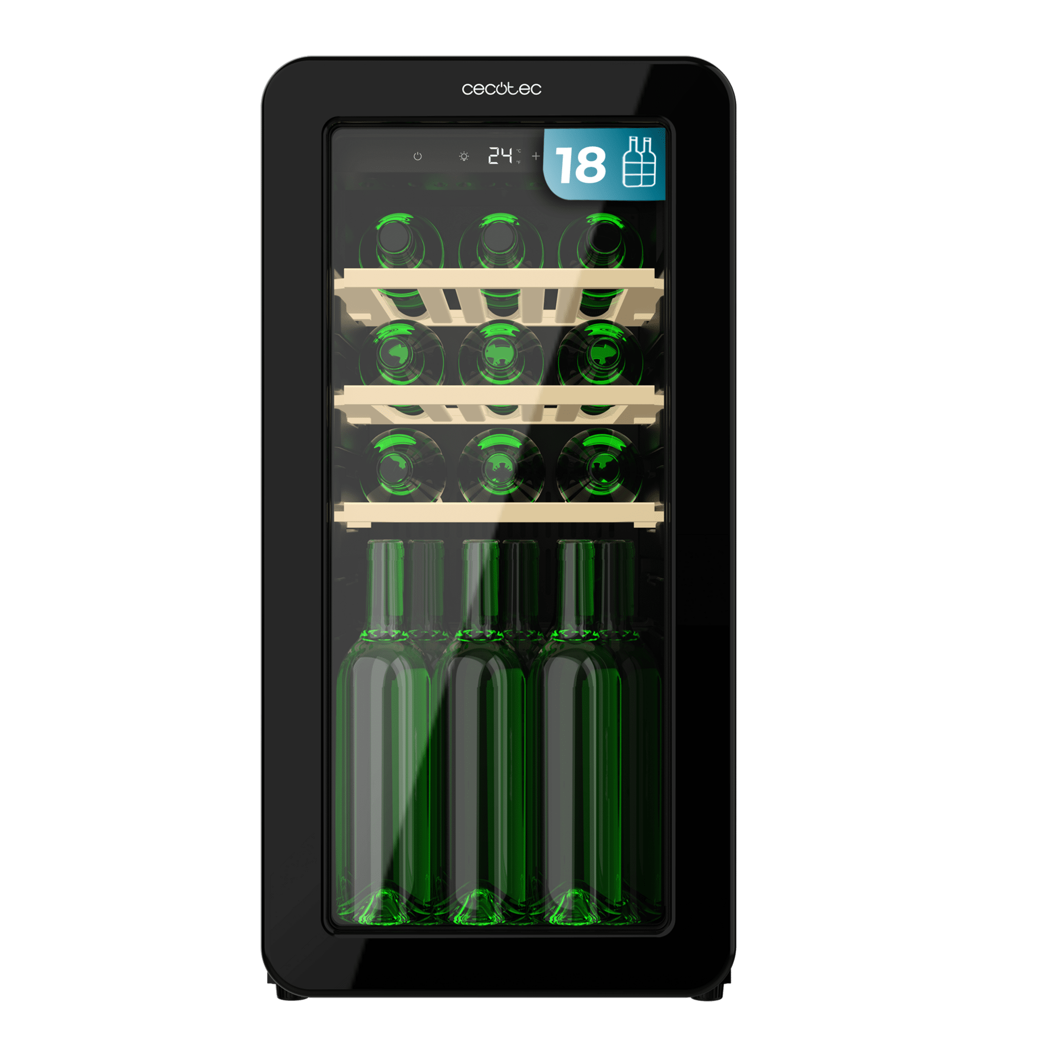 Vinoteca diseño retro color negro, Capacidad 18 botellas, Temperatura 5 a 20ºC, Estantes madera, Control electrónico, Display LED, NoFrost, Luz interior, Ventilación interna, Alto 74cm, Ancho 36,6cm