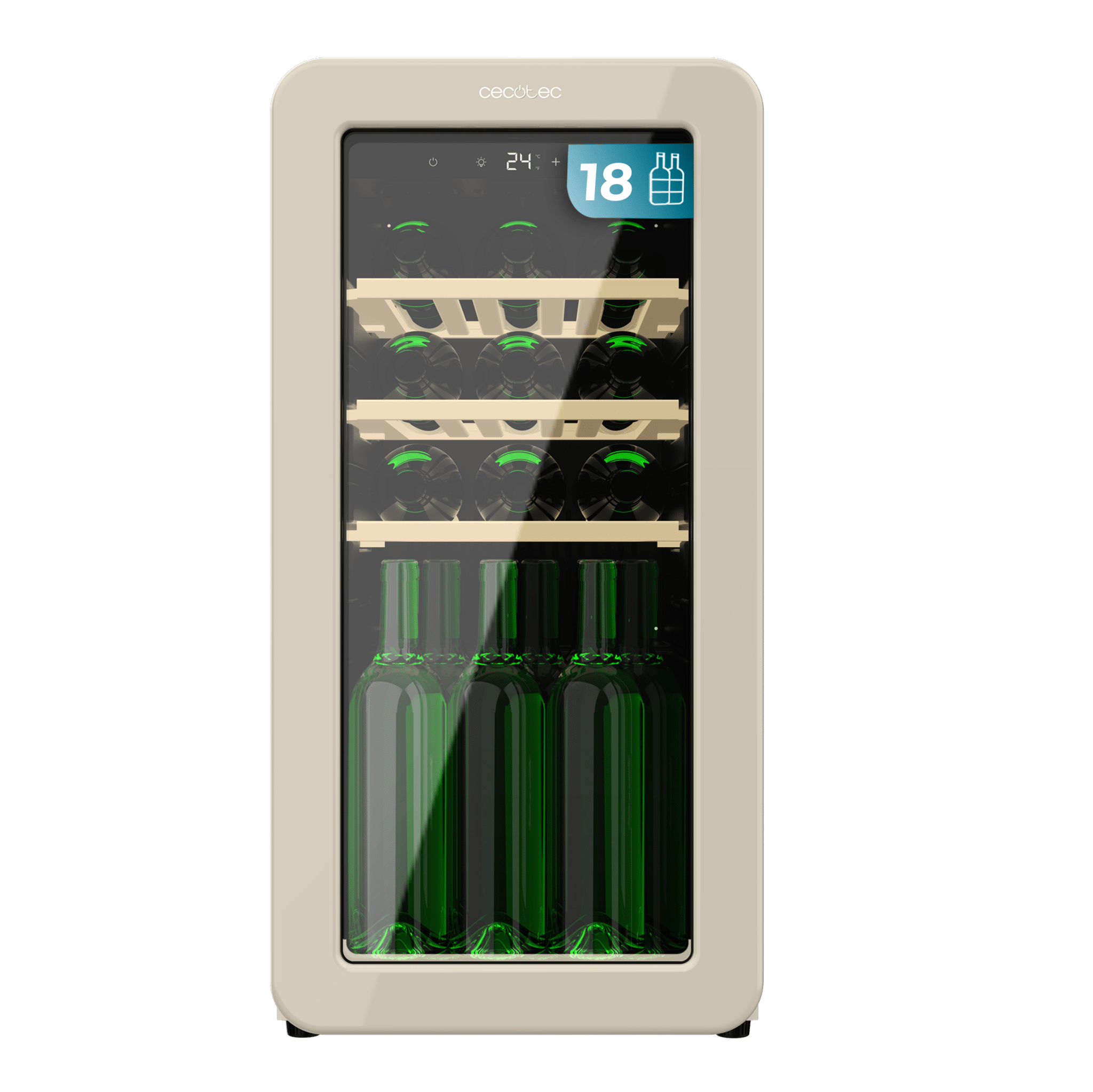 Vinoteca diseño retro color beige, Capacidad 18 botellas, Temperatura 5 a 20ºC, Compresor, Estantes madera, Control electrónico, Display LED, NoFrost, Luz interior, Ventilación interna, Alto 74cm, Ancho 36,6cm