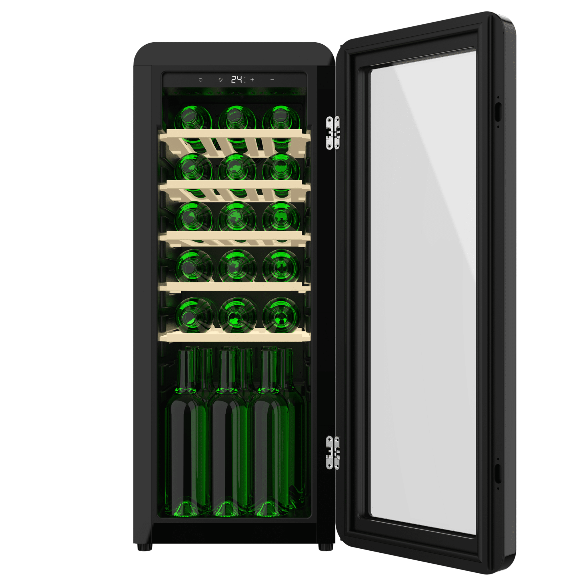 Vinoteca diseño retro color negra, Capacidad 24 botellas, Temperatura 5 a 20ºC, Estantes madera, Control electrónico, Display LED, NoFrost, Luz interior, Ventilación interna, Alto 92,8cm, Ancho 36,6cm