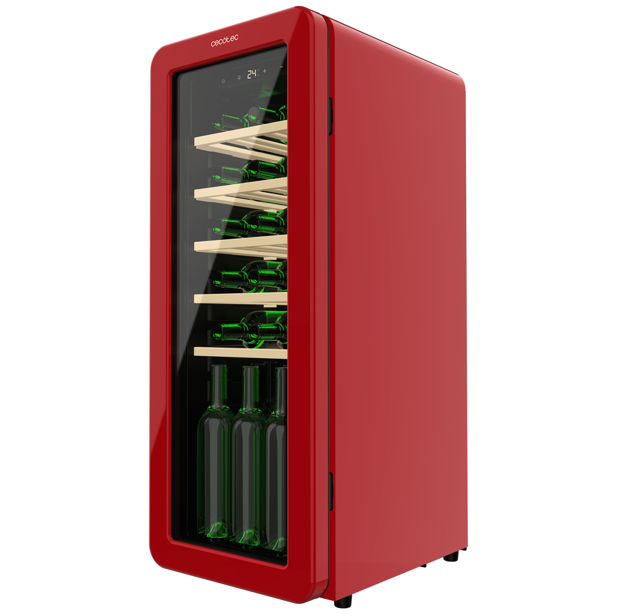 Vinoteca diseño retro color rojo, Capacidad 24 botellas, Temperatura 5 a 20ºC, Estantes madera, Control electrónico, Display LED, NoFrost, Luz interior, Ventilación interna, Alto 92,8cm, Ancho 36,6cm