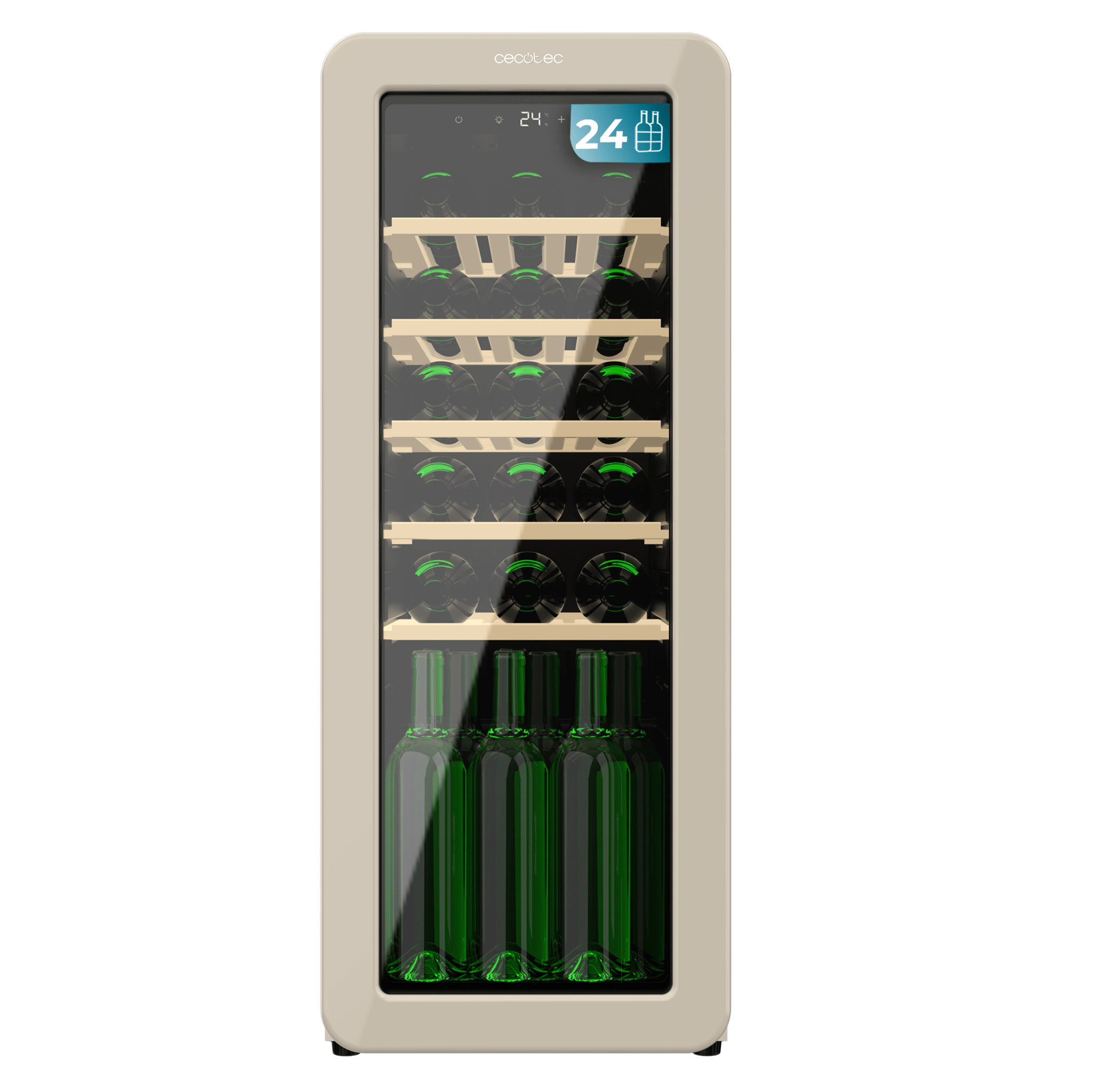 Vinoteca diseño retro color beige, Capacidad 24 botellas, Temperatura 5 a 20ºC, Estantes madera, Control electrónico, Display LED, NoFrost, Luz interior, Ventilación interna, Alto 92,8cm, Ancho 36,6cm
