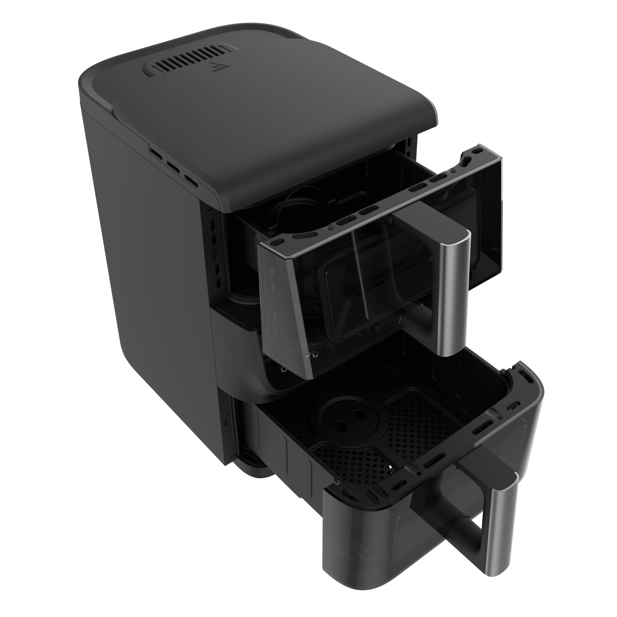Freidora de aire de 10L con ventanas, con cubetas superpuestas de 3.5L y 6.5L, 2000 W de potencia, control táctil, y 10 programas preconfigurados para una cocción rápida y saludable.