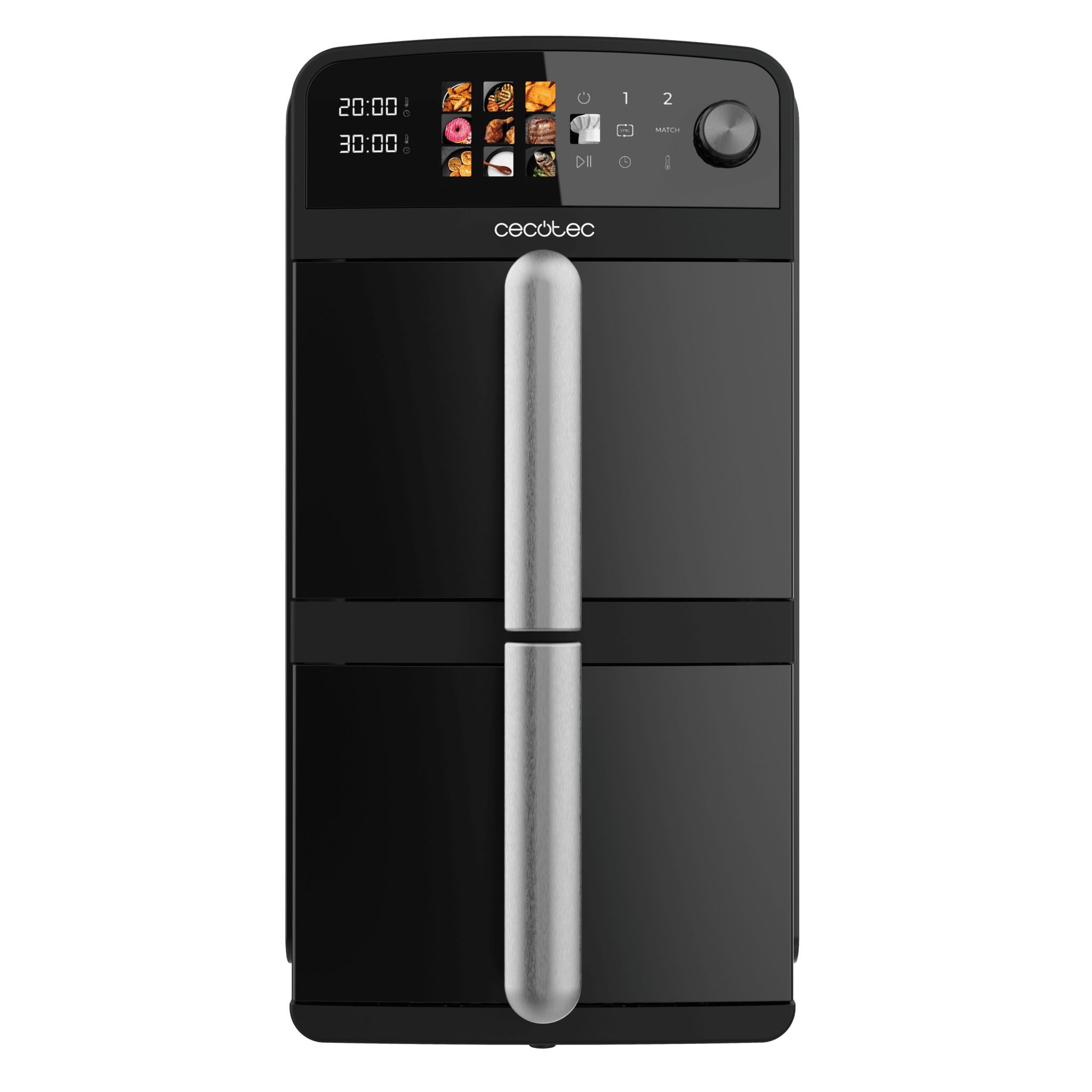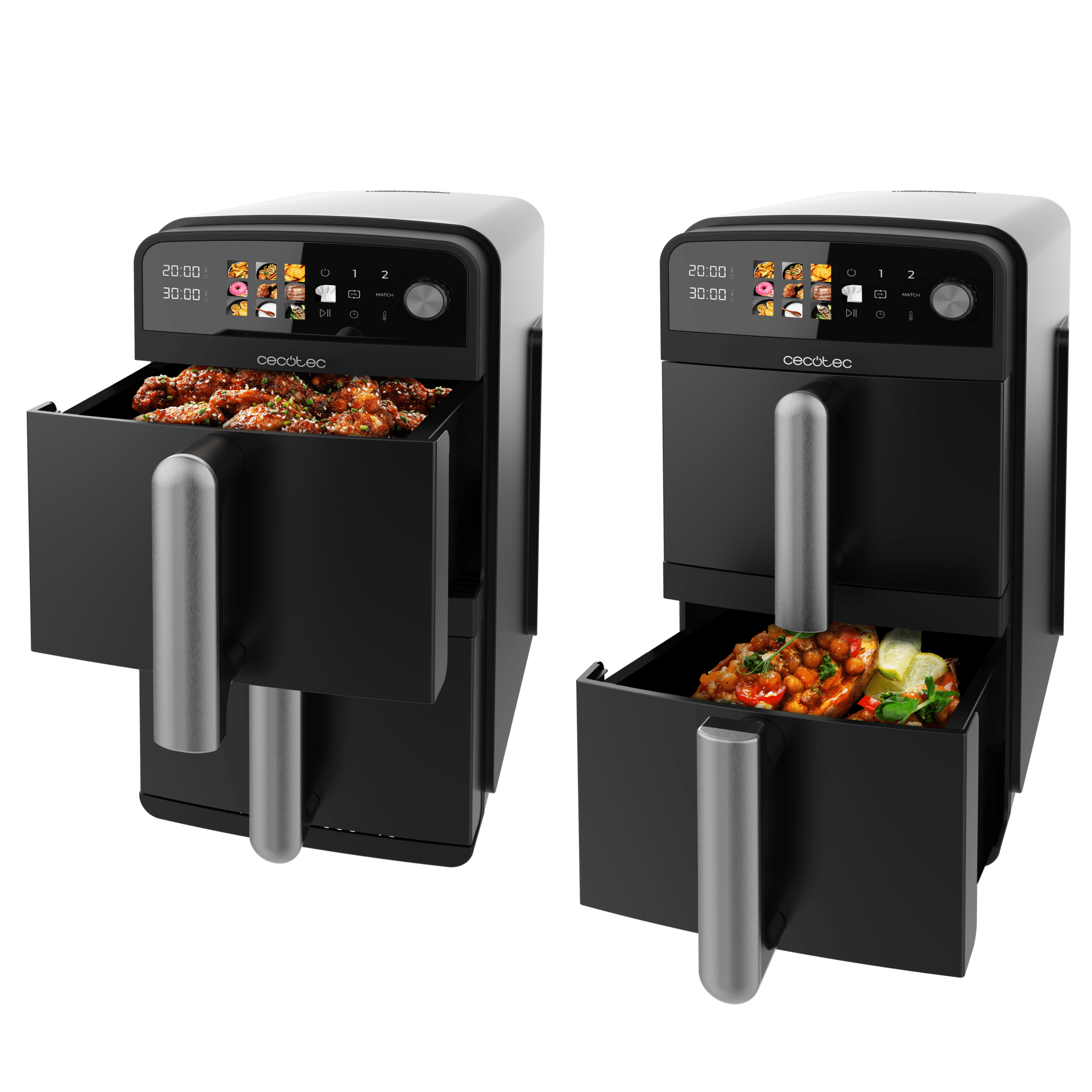 Freidora de aire de 10L con cubetas superpuestas de 5L, 2400 W de potencia, control táctil, y 6 programas preconfigurados para una cocción rápida y saludable.