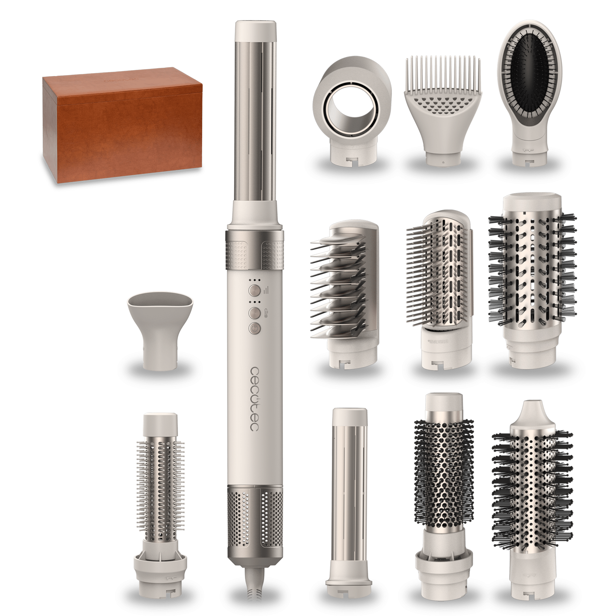 Moldeador multifunción 12 en 1 con tecnología Coanda que moldea, riza, peina, seca y elimina el efecto frizz. Con 3 velocidades, 3 temperaturas, y control inteligente del calor. Motor digital 1400 W de potencia y 110000 rpm. Cabezales con revestimiento de cerámica y keratina.