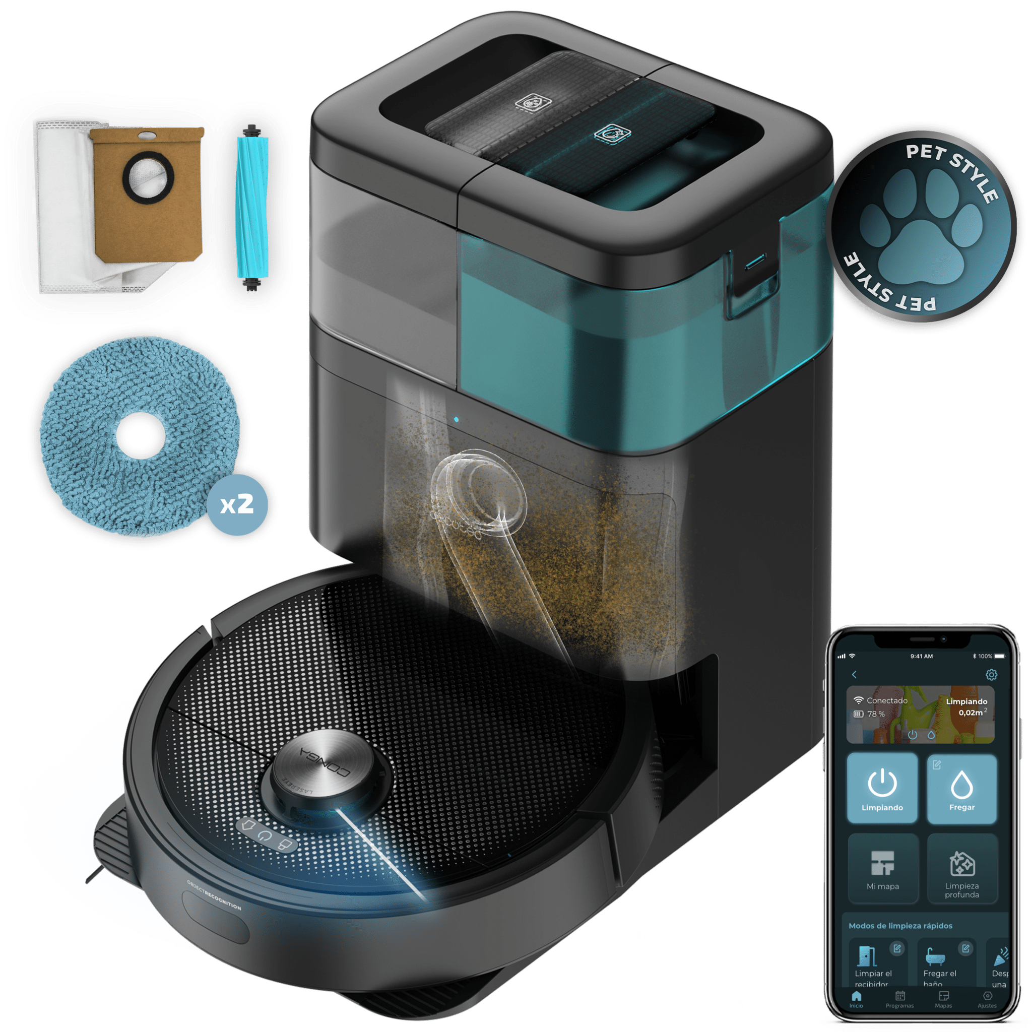 Robot aspirador Conga 15090 SpinArm Home&Wash. Tecnología láser de navegación. Base de autovaciado con tanques de polvo y agua, limpieza y secado de mopas. Cepillo de silicona. Mopas giratorias y elevables. Cepillo lateral. Motor de succión 8000 Pa. App y asistentes virtuales.