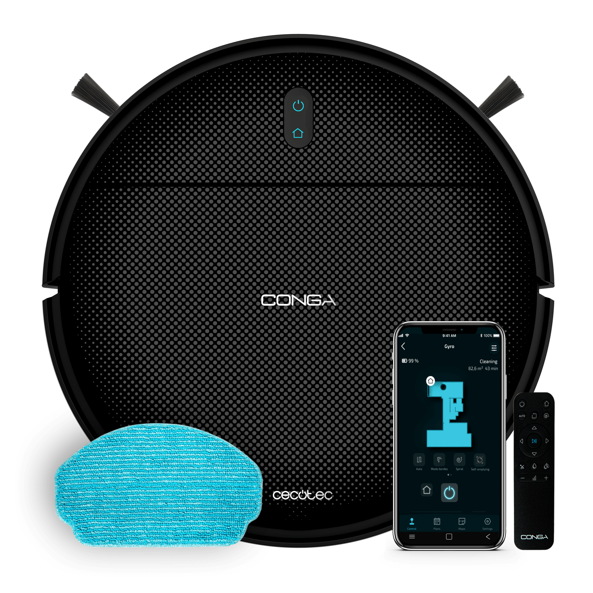 Robot aspirador Conga 999 Map Genesis con navegación giroscópica para una limpieza total de la casa. Motor de succión de 2000 Pa. 2 cepillos laterales.Mopa de fregado. Autonomía de 120 minutos. Control con APP de CECOTEC y con mando a distancia. Conectividad WiFi 2,4 GhZ y Bluetooth.