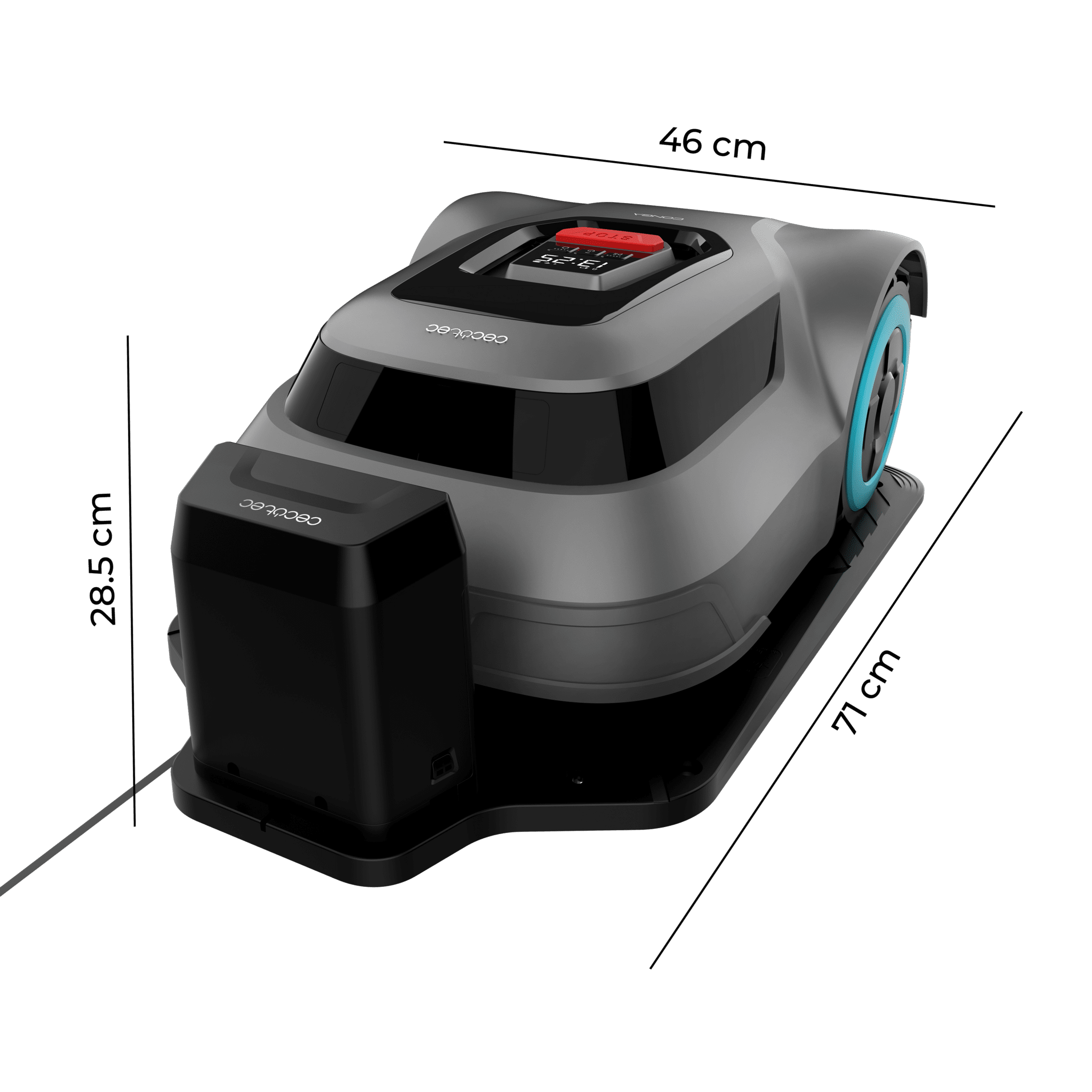 Robot cortacésped. Motor Digital Brushless. Corte ordenado. Para superficies de hasta 500 m2. Pendiente máxima de 45%. Regulador de las hojas de corte. Sensor detector de lluvia. Control APP.