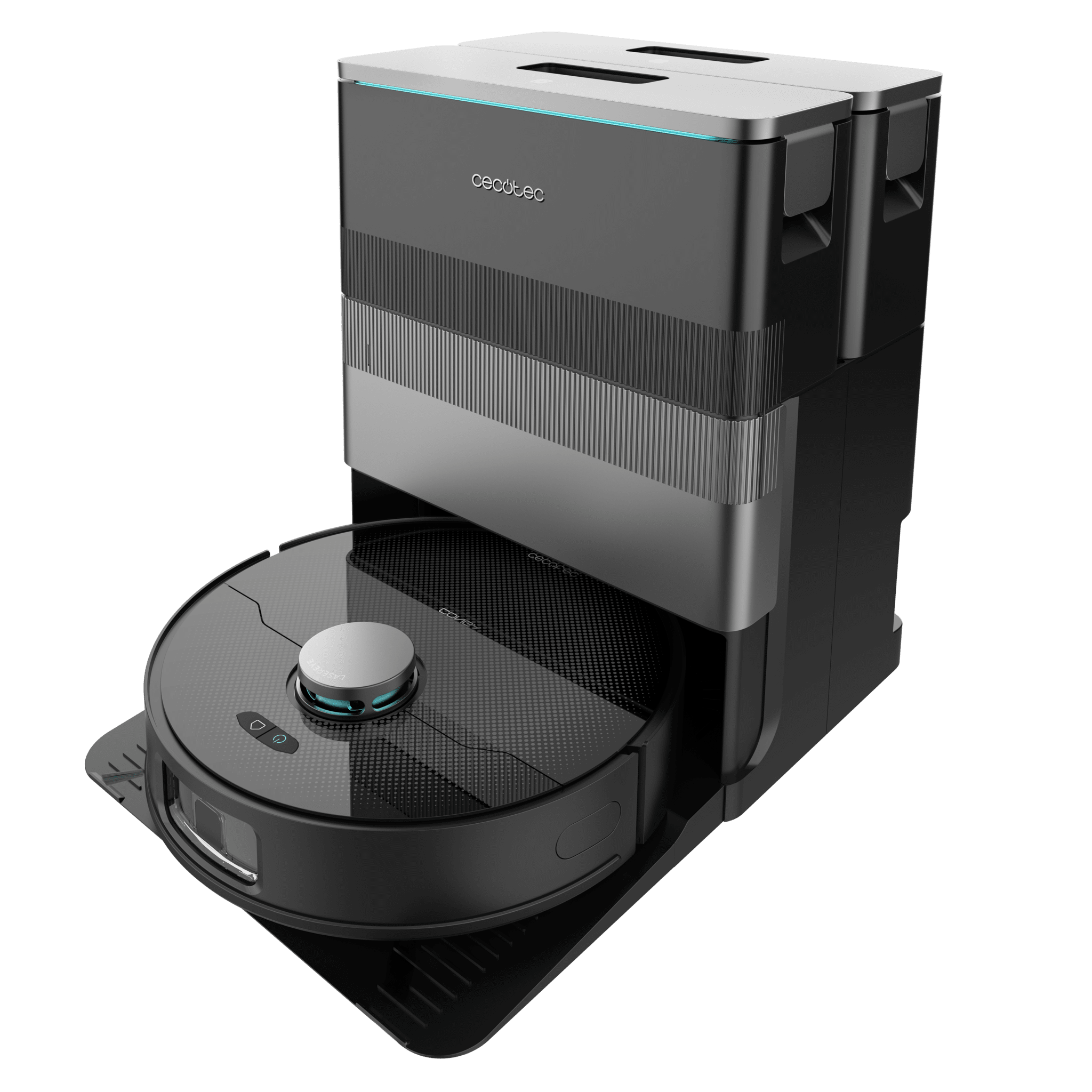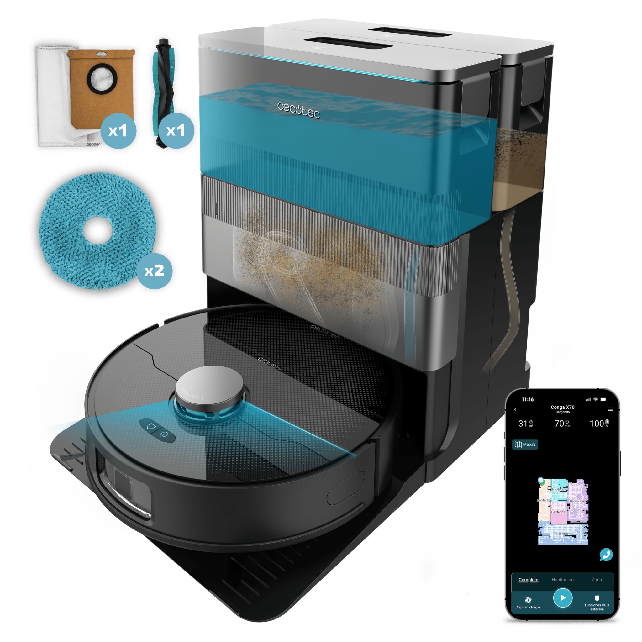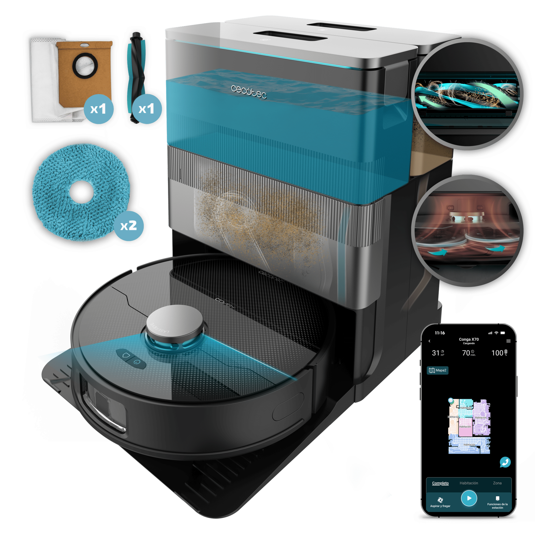 Robot aspirador con tecnología láser y mopas giratorias. Base total de autovaciado de polvo, de agua y limpieza de las mopas.