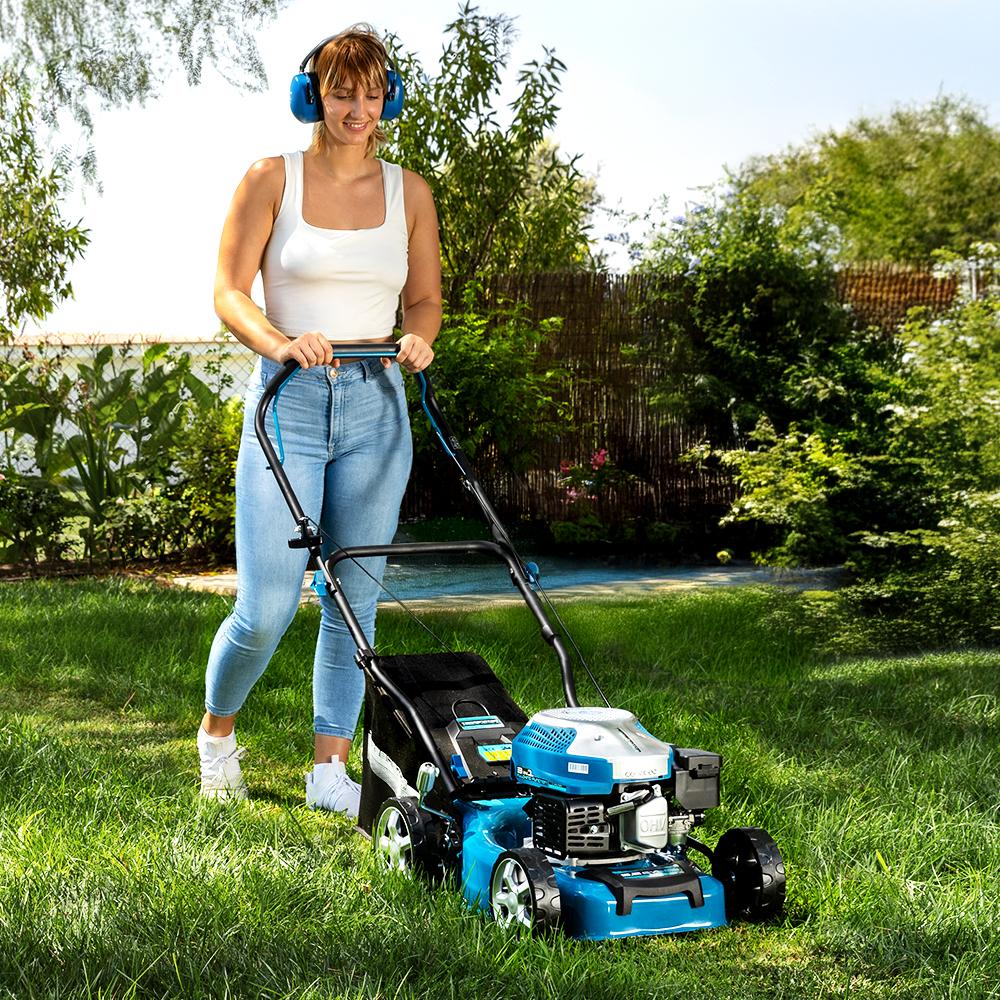 Cortacésped de gasolin de 144cc. Cuerpo de acero 41cm. Cambio de altura sistema Z-Tech. 3in1 con mulching. Ruedas traseras XL
