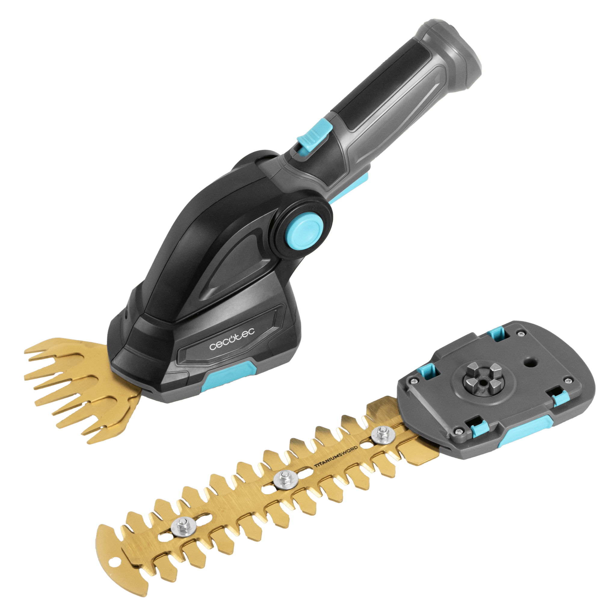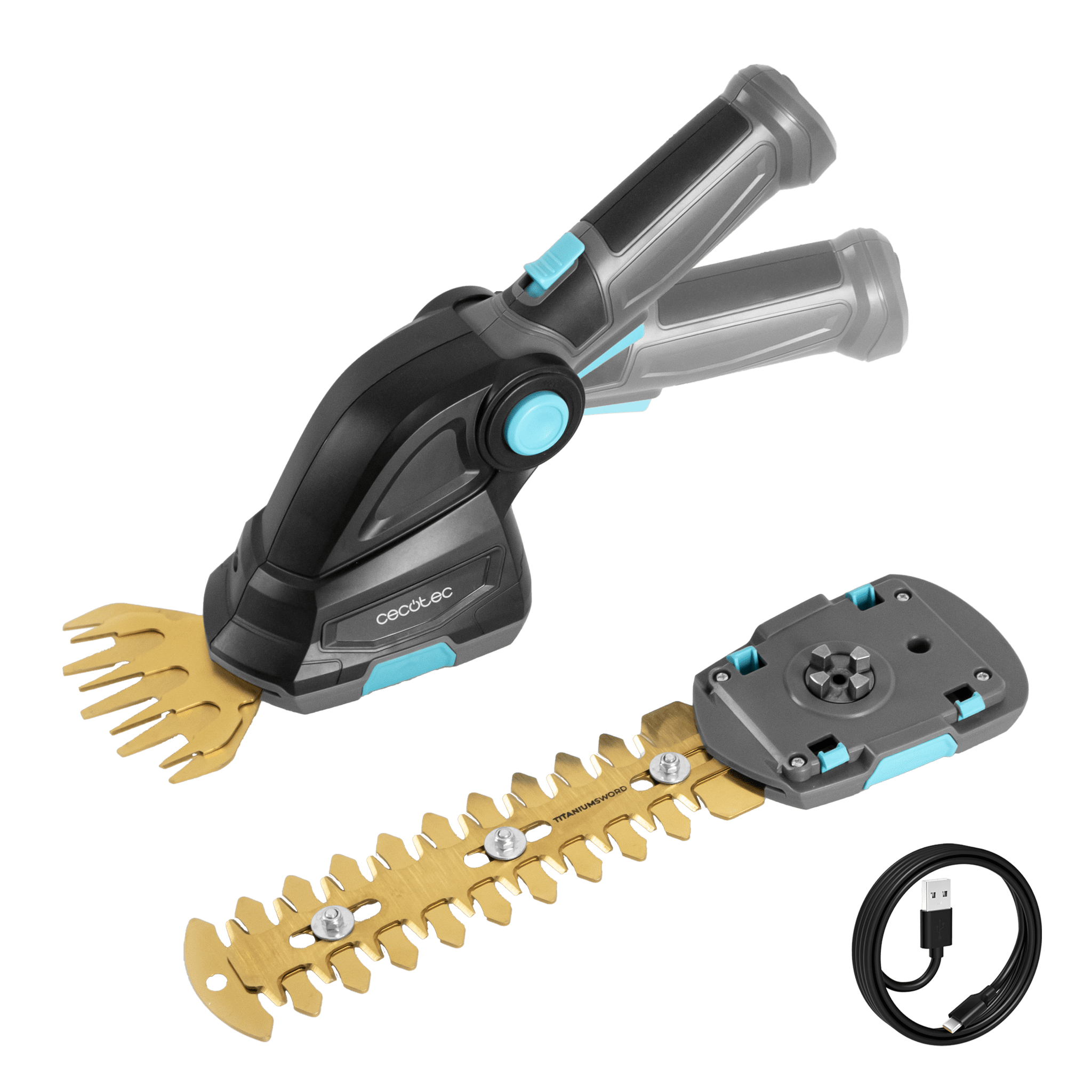 Cortasetos de mano 2en1. Batería integrada 7,2V. Cuchillas de titanio. Incluye dos acesorios para diferentes tipos de corte.