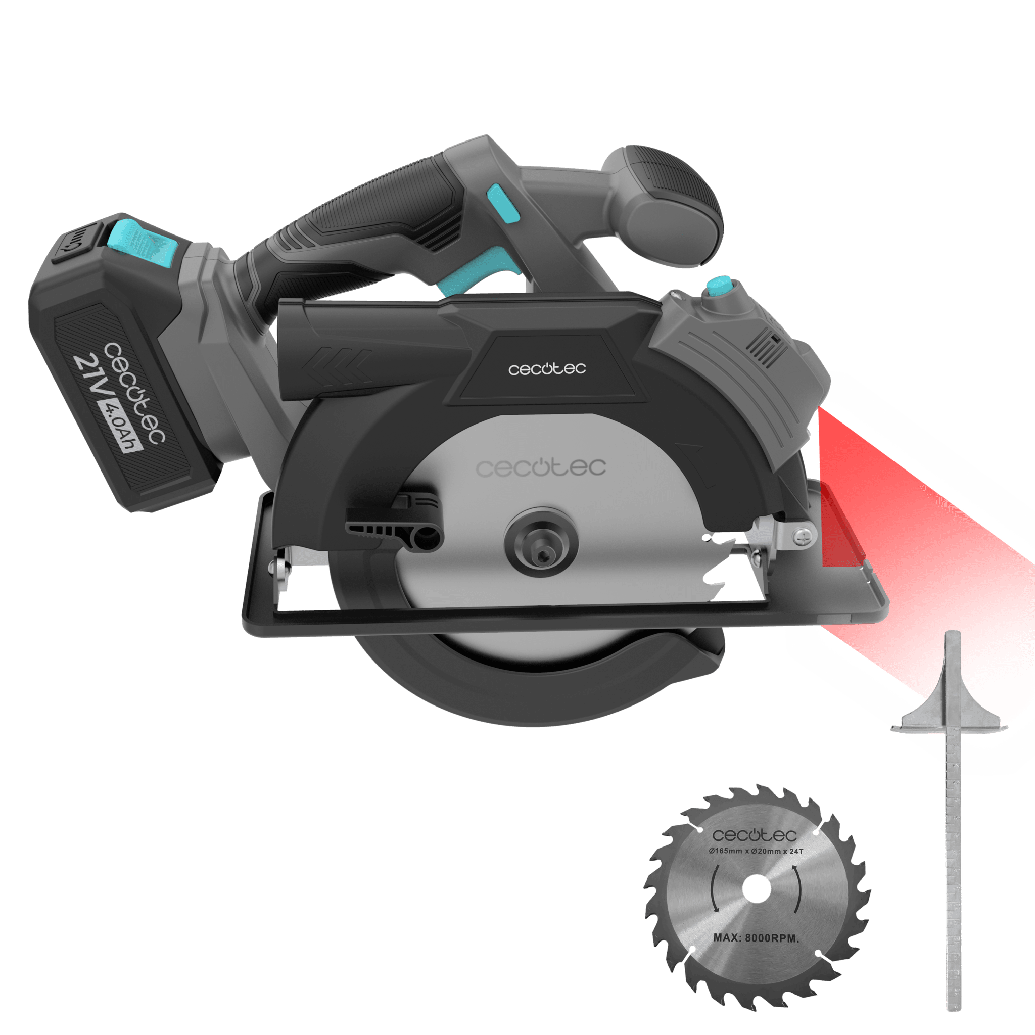 Sierra circular batería 21V. Motor sin escobillas, Brushless. Disco de 165mm. Profunndidad de corte ajustable. Guía láser y guía paralela. Accesorio conector aspirador.