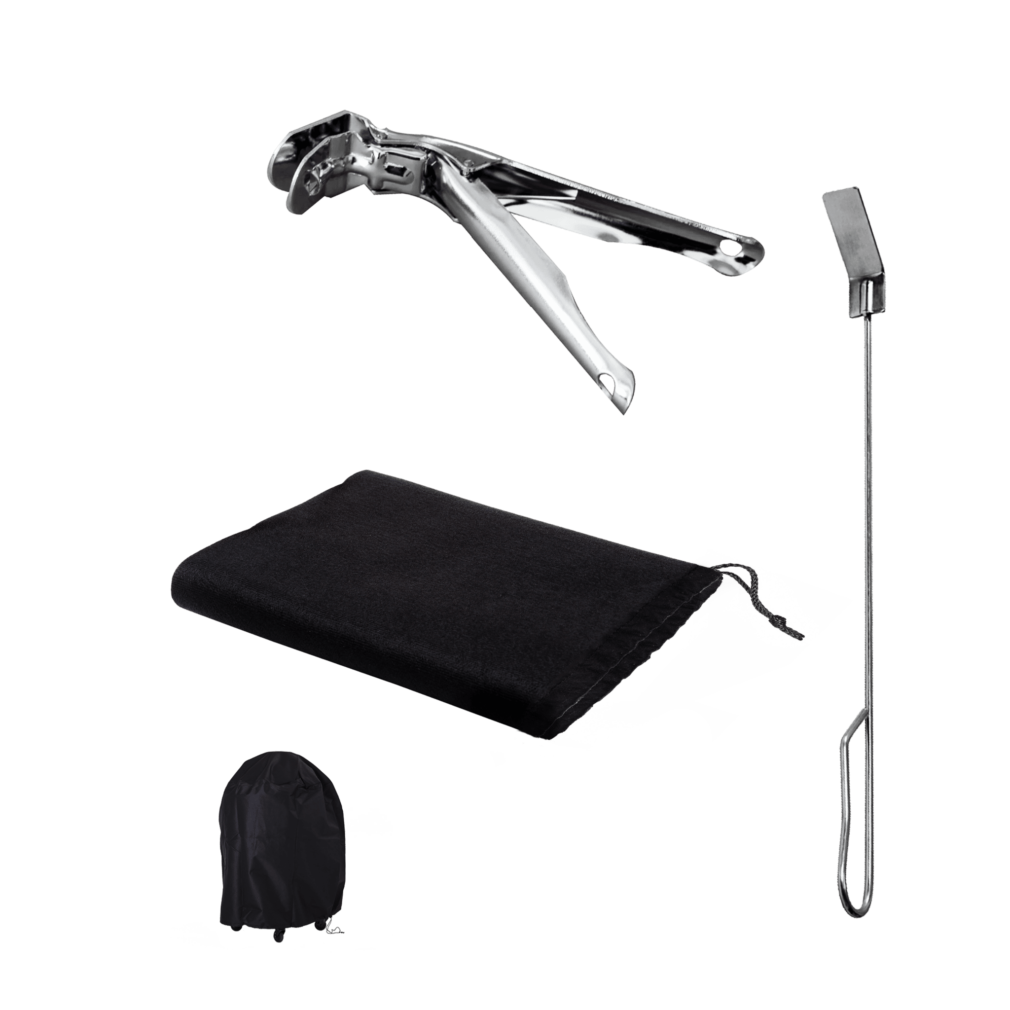 Pack de accesorios para barbacoa kamado DragonFire 6600 que incluye pinzas, cubierta protectora, recolector de cenizas y expansor de parrilla.