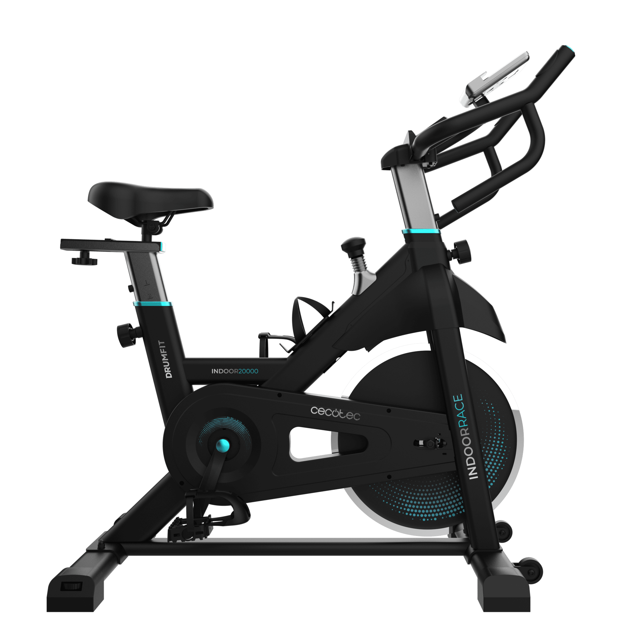 Bicicleta indoor de spinning con volante de inercia de 20 Kg. Pulsómetro. Pantalla LCD. Soporte para dispositivos y botella. Ruedas de transporte. Resistencia por fricción. Sillín ajustable vertical y horizontalmente.