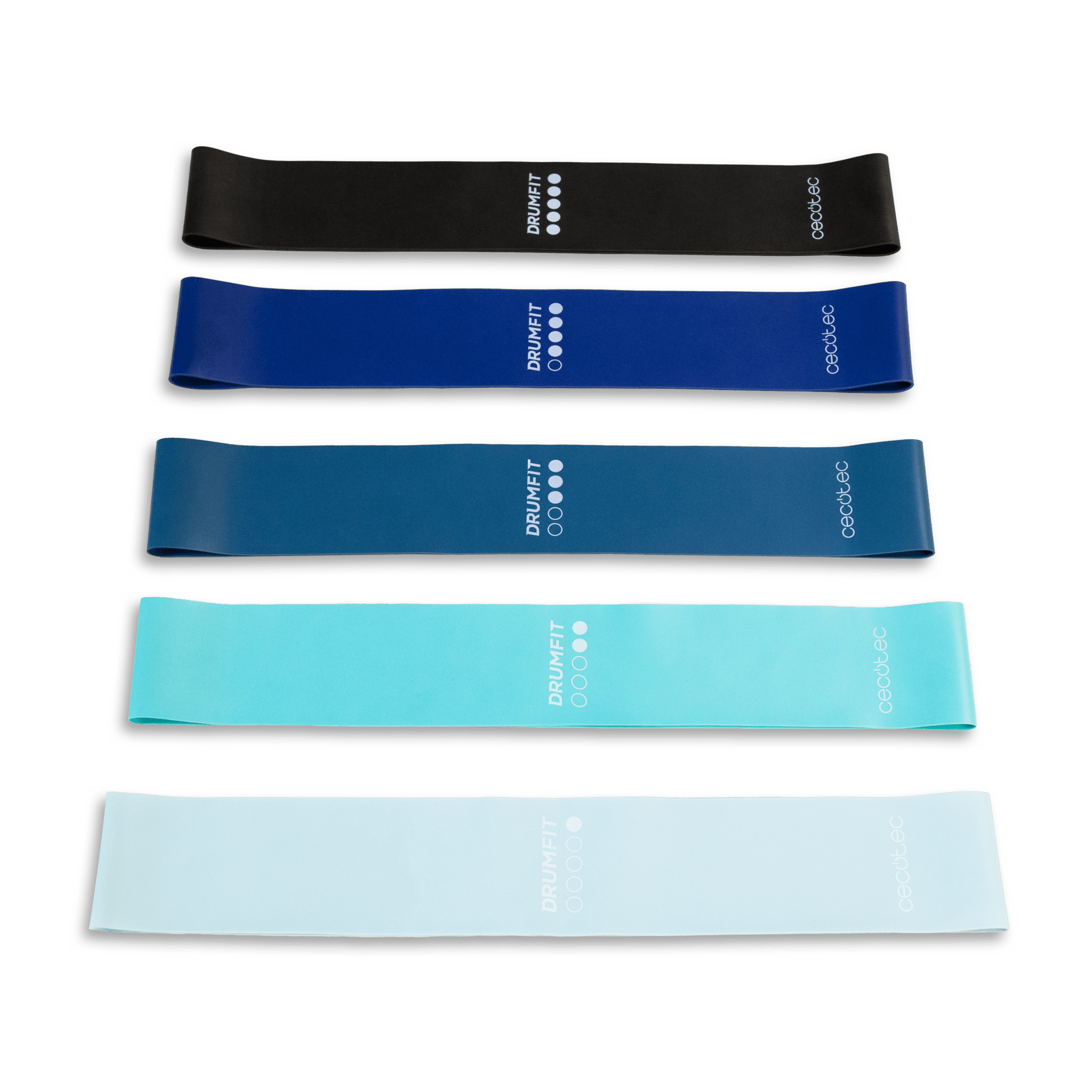 Cecotec Bandas elásticas DrumFit Resistance Band Set Set de 5 cintas elásticas de resistencia de látex con distintos niveles y bolsa de transporte incluida.
