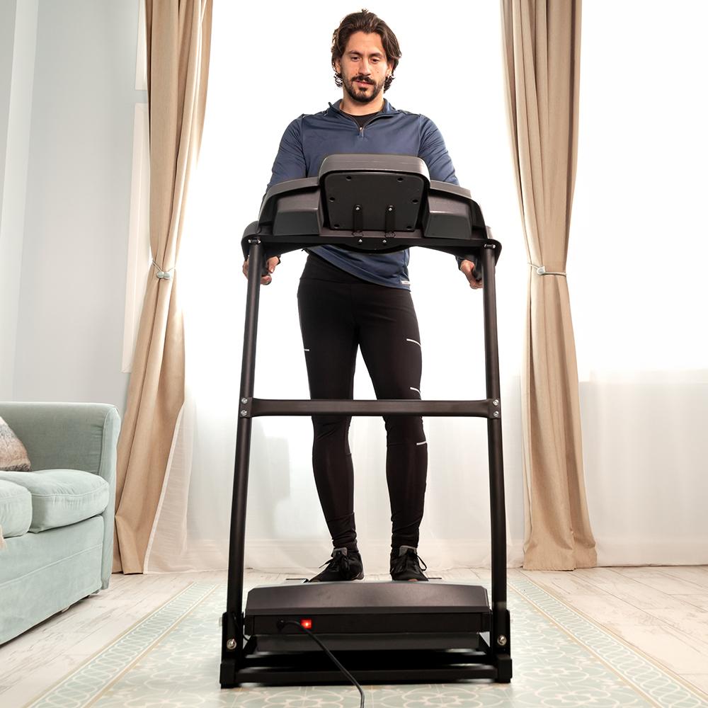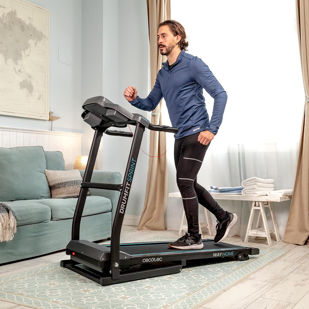 DrumFit WayHome 1500 Sprint Cinta de correr plegable con potencia de 1500 W / 2,5 CV. De 1 a 15 Km/h. 12 programas predefinidos. Panel de control LCD. Superficie de carrera de 120×40 cm. Inclinación manual. Plegable, con ruedas de transporte, pulsómetro, sistema de seguridad magnético y soporte para dispositivos.