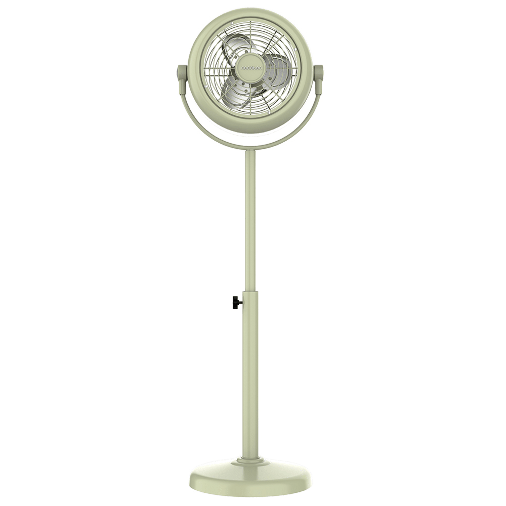 Ventilador de pie estilo retro color verde de 10″ con 25 W e inclinación ajustable.