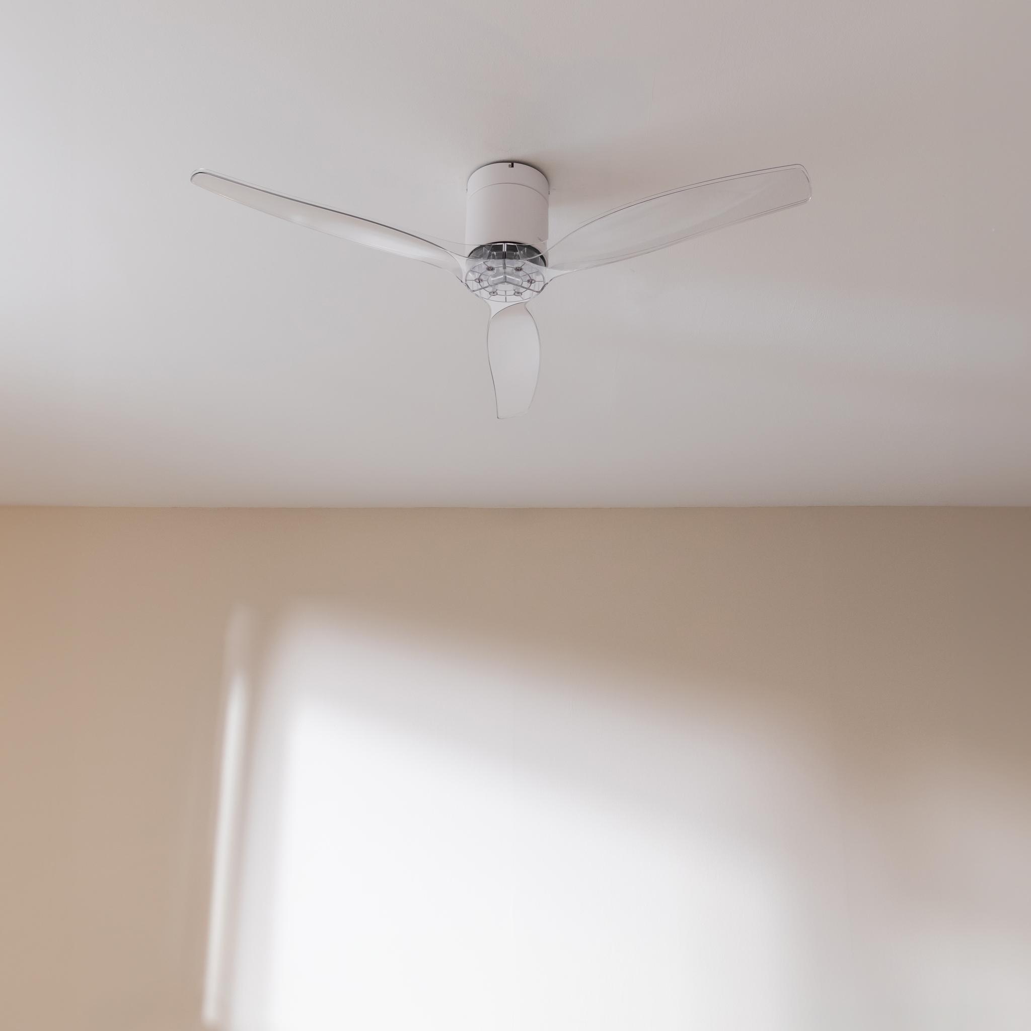 Ventilador de techo de 40 W y 52” con mando a distancia, control por wifi y mando a distancia, protección IP44, 6 velocidades, 3 aspas, modo winter-summer y temporizador de hasta 8 horas.