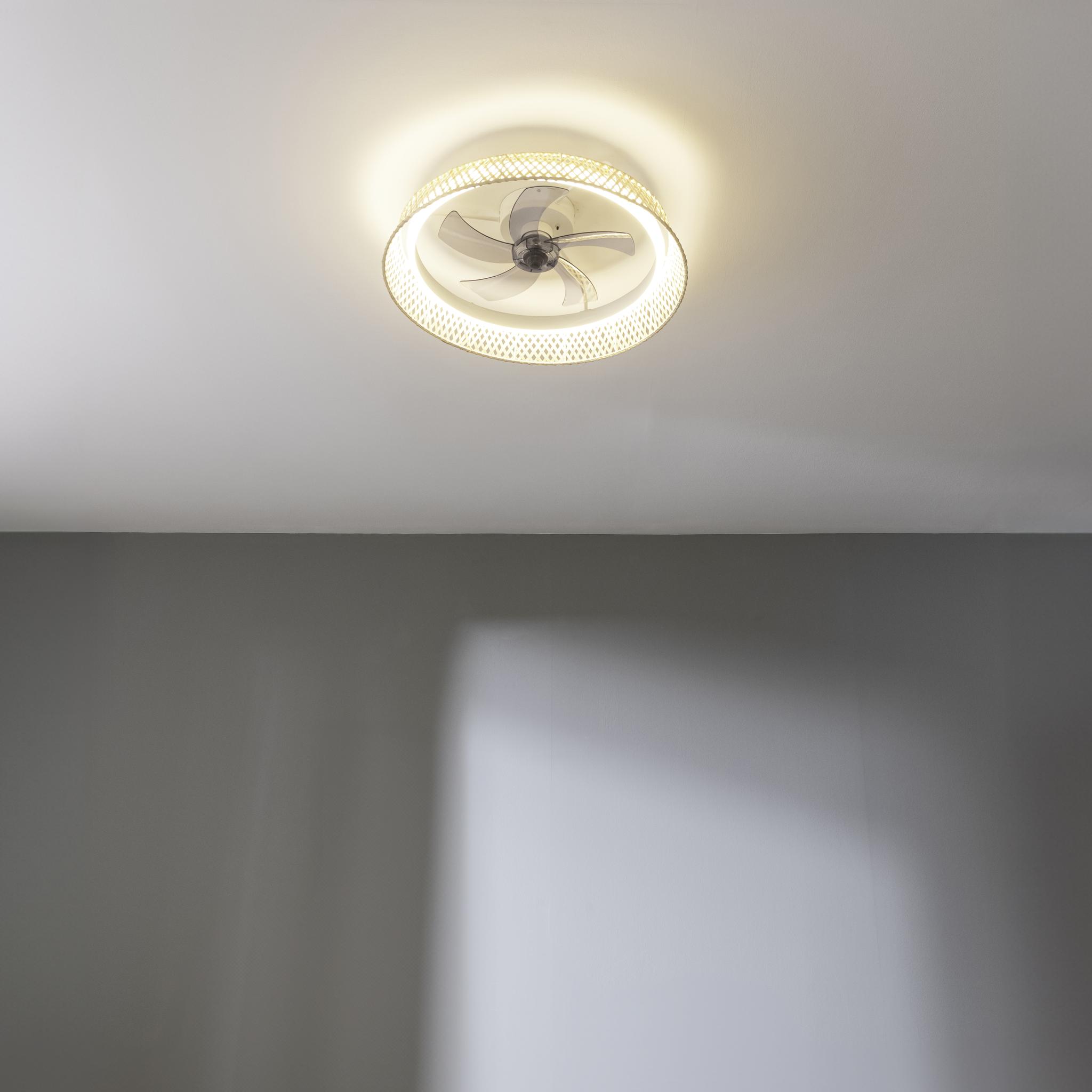 Ventilador de techo de diseño con motor DC de 15W de potencia y luz LED de 45W , con 5 aspas de 17 pulgadas , control remoto, 3 velocidades, 3 tonalidades de luz disponibles, temporizador y modo winter/summer.